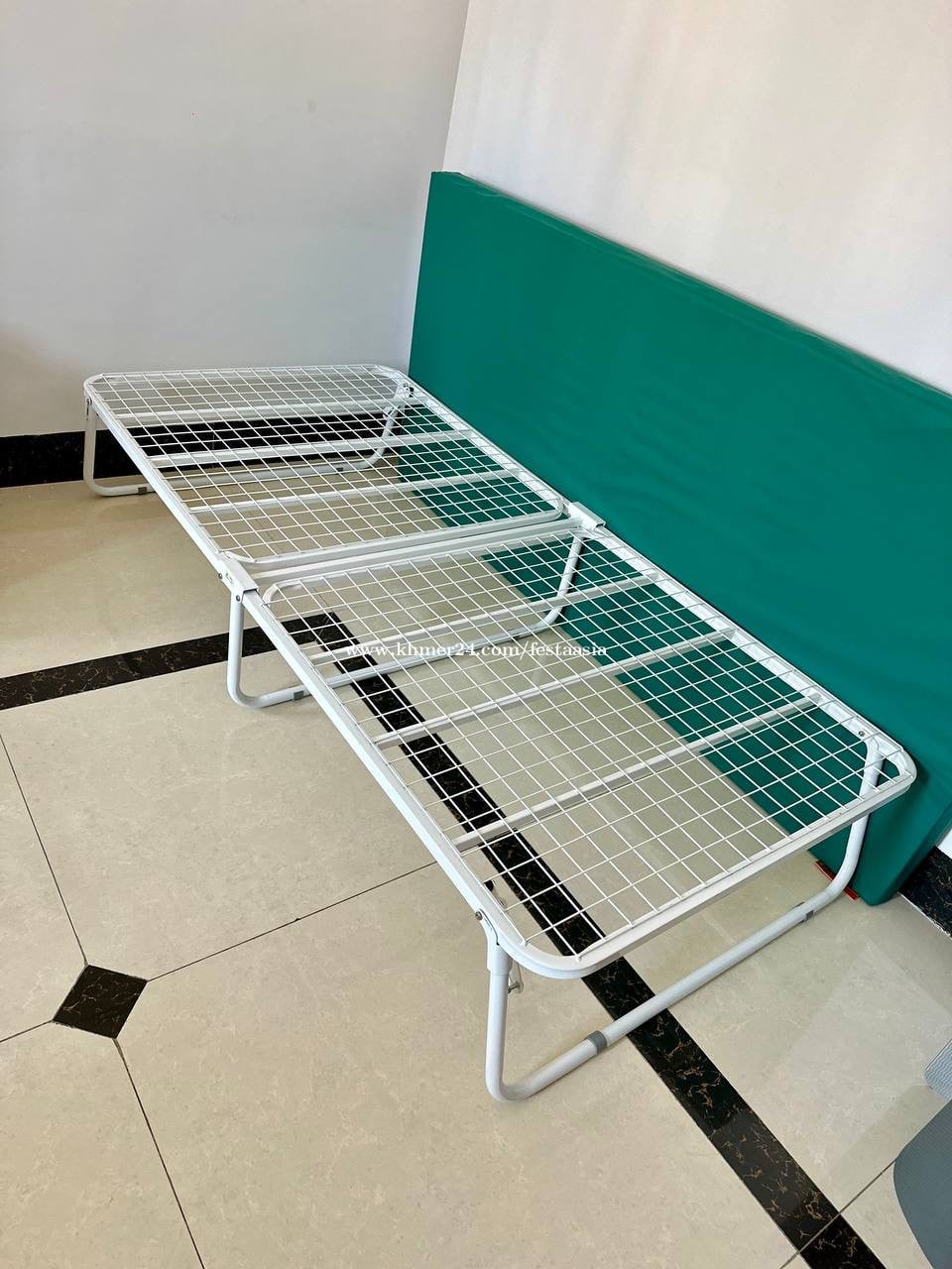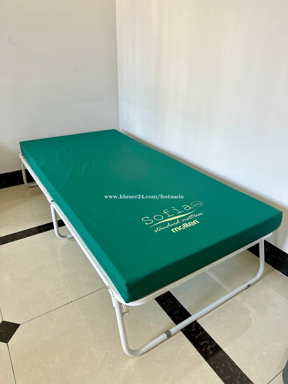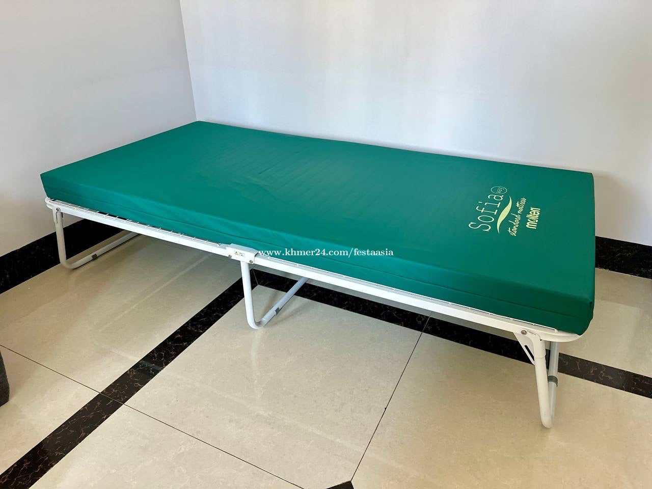 Sturdy metal frame with a full-size single sleeping surface. (Japan) Folds into a compact position for easy storage and easy moving. Ideal for guests, apartments, condos, or rental units. Mattress is almost new, in excellent condition, used for about 2 months. Pick-up only.