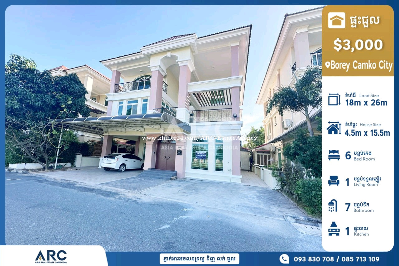 #VIP Villa For Rent at Borey Camko City #វីឡាទោលដាក់ជួលបន្ទាន់នៅក្នុងបុរី កាំកូ សុីធី 🔹 តម្លៃជួល / Rent Price $3,000 (ចរចម្ចាស់ផ្ទាល់) 🔹 ទំហំផ្ទះ/ House size: 14.5m x 15.5m 🔹 ទំហំដី / land size: 18m x 26m 🔹 បន្ទប់គេង Bedroom: 06 បន្ទប់ទឹក Bathroom: 07 📍#永旺2附近 出租价格:$3,000 美金/可谈 房间数量:06 房 , 07卫 建筑面积:14.5米 X 15.5米 土地面积:18米 X 26米 085713xxxClick To Call / 093830xxxClick To Call / 0978899xxxClick To Call Chat to Telegram Agent https://t.me/sonsela14 Channel Telegram https://t.me/ARCKhanResseykeo 👉 អាជ្ញាប័ណ្ណ៖ EV-08-069V
