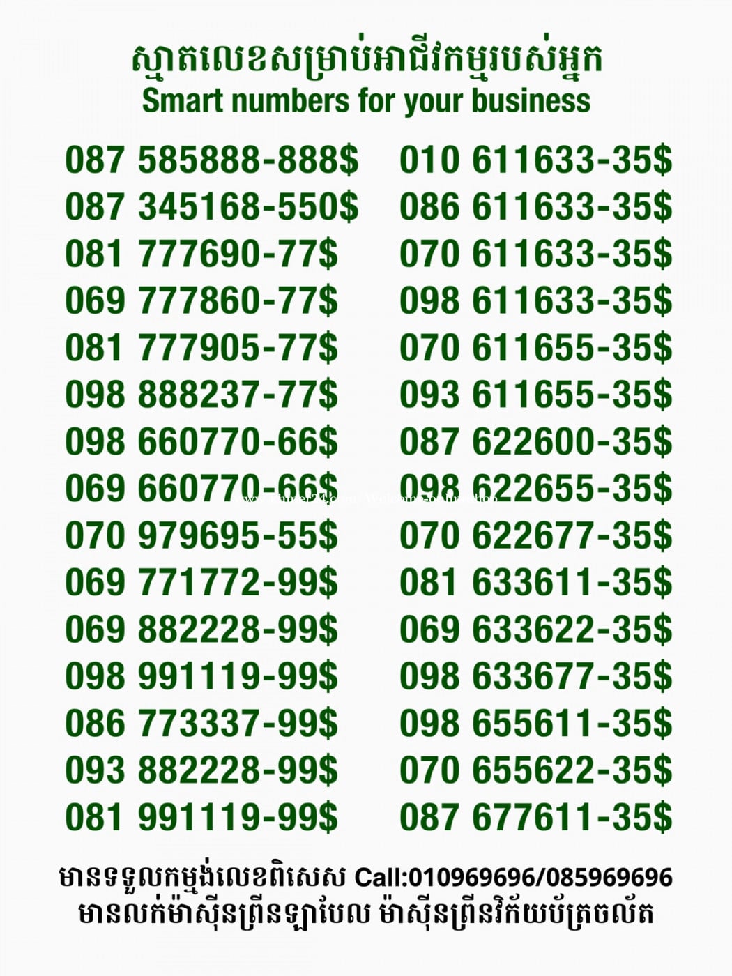 មានលក់លេខពិសេស មានទទួលកម្មង់លេខពិសេស មានលក់ម៉ាស៊ីនព្រីនឡាបែល មានលក់ម៉ាស៊ីនព្រីនវិក័យប័ត្រ មានលក់សម្ភារៈប្រើប្រាស់ក្នុងគ្រួសារ Smart Prime II 1=30$ Smart hero 1=40$ ទូរសព្ទថ្មីក្នុងប្រអប់ លក់ធូរៗរហូតអស់ពីស្តុក អាចប្រើជាឧបករណ៍សម្រាប់ស៊ែរ wifi បាន ទំនាក់ទំនង(ខ្មែរ | English | 中文):010969696 | 085969696 Telegram: https://t.me/W9696 Telegram group: https://t.me/konkonnada អាសយដ្ឋាន:ផ្ទះលេខ២៣ ផ្លូវបេតុងលេខ១ ភូមិទួលពង្រ សង្កាត់ចោមចៅ ខណ្ឌពោធិ៍សែនជ័យ រាជធានីភ្នំពេញ ទីតាំង https://goo.gl/maps/8moqW4iTHUfJEvWQ9 ដើម្បីស្វែងរកលេខអាជីវកម្មដែលលោកអ្នកពេញចិត្ត សូមចូលទៅកាន់:https://www.khmer24.com/Welcome-onlineshop