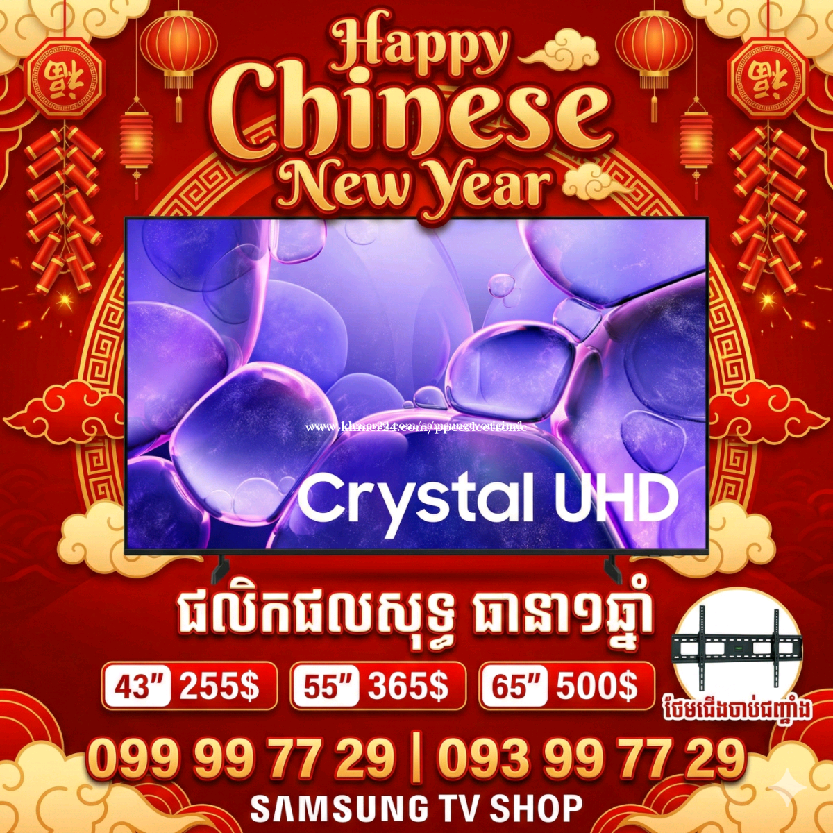 Happy Chinese New Year" (សួស្តីបុណ្យចូលឆ្នាំចិន) នៅលើទូរទស្សន៍៖ "Crystal UHD" អត្ថបទពណ៌សធំនៅពីក្រោមទូរទស្សន៍៖ "ផលិតផលសុទ្ធ ធានា១ឆ្នាំ" មាន3 ទំហំផលិតផលសុទ្ធ 2025 AI ធានារយះពេល ១ឆ្នាំ ពីក្រុមហ៊ុន "43” 255$" 43U8000F 2025 AI 4K UHD ថែមជើងចាប់ជញ្ជាំង សេវាដឹក ៥ដុល្លារក្នុងភ្នំពេញ "55” 365$" 55U8000F 2025 AI 4K UHD ថែមជើងចាប់ជញ្ជាំង សេវាដឹក ៥ដុល្លារក្នុងភ្នំពេញ "65” 500$" 65U8000F 2025 AI 4K UHD ថែមជើងចាប់ជញ្ជាំង សេវាដឹក ៥ដុល្លារក្នុងភ្នំពេញ "ថែមជើងចាប់ជញ្ជាំង" លេខទូរស័ព្ទ៖ "CellcardCellcard099997xxxClick To Call | SmartSmart093997xxxClick To Call ឈ្មោះហាង៖ "SAMSUNGG TV SHOP"