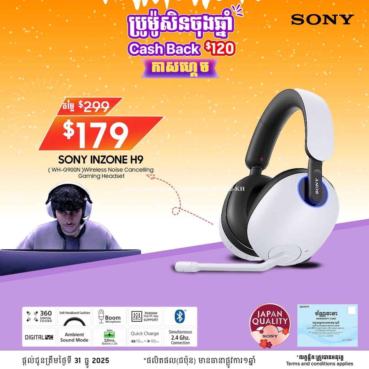 Sony INZONE H9 មុខងារ: - បច្ចេកវិទ្យា Dual Noise Sensor បំបាត់សំឡេងក្រៅ - សម្លេង 360° សម្រាប់កំណត់ទីតាំងគូប្រកួត - Ear pads ស្រាល - ថ្មអាចប្រើបានដល់ 32 ម៉ោងនិងសាកលឿន - ខ្សែ Bluetooth រឹង (សម្រាប់ PC, PS5, ទូរស័ព្ទ) Key Features: - Dual Noise Sensor Technology for powerful noise cancellation - 360 Spatial Sound for precise enemy detection - Super comfortable soft-fit leather ear pads for long gaming sessions - Up to 32 hours of battery life with quick USB-C charging - Wireless and Bluetooth connectivity (2.4GHz low latency + Bluetooth) - Compatible with PC, PS5, and mobile សាកសមសម្រាប់អ្នកលេងហ្គេមគ្រប់ប្រភេទ ដែលចង់បានសម្លេងនឹងទីតាំងច្បាស់! Contact: 017555xxxClick To Call