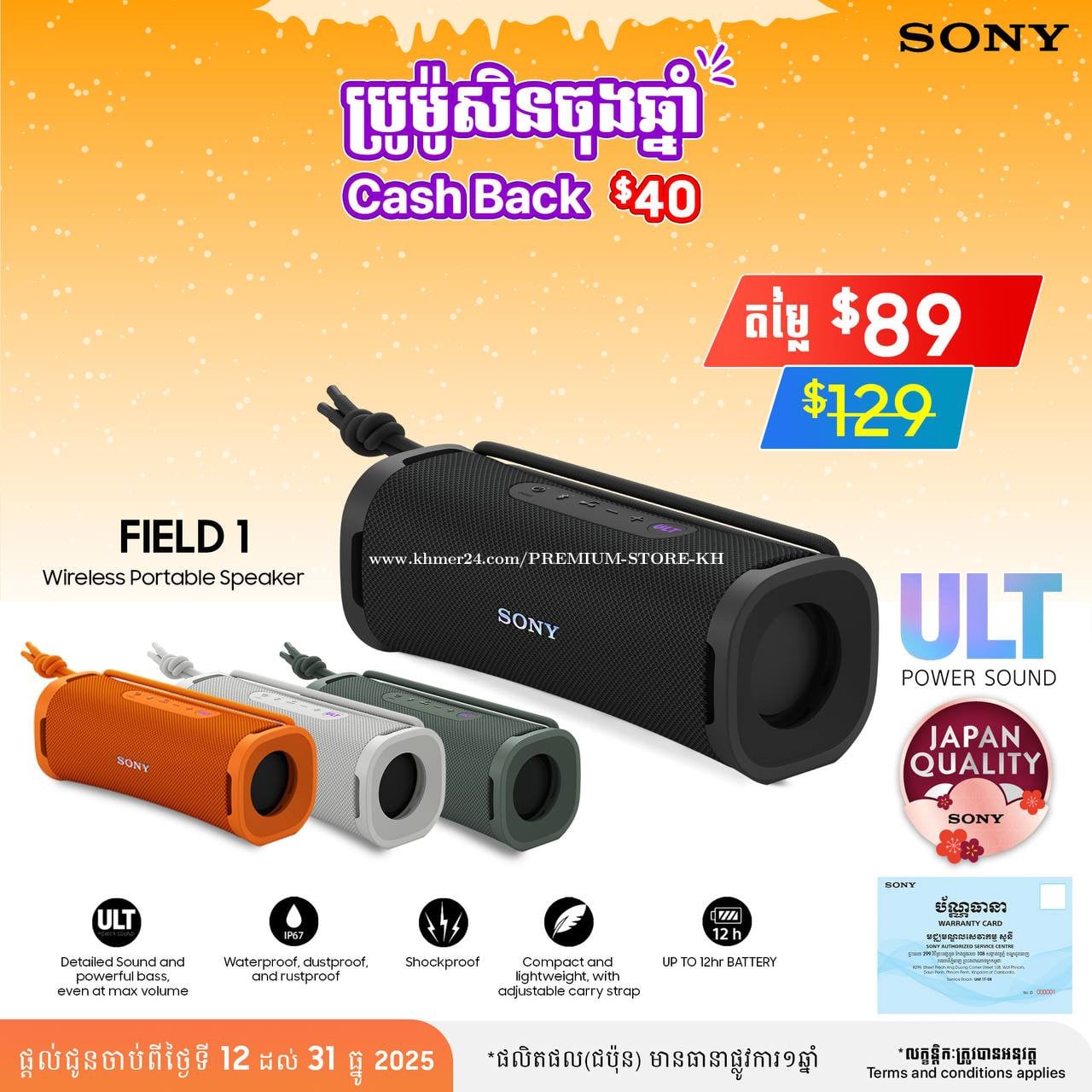 Speaker Sony ULT FIELD 10 Sony ULT FIELD 1 គឺជា Bluetooth speaker ដែល Sony បង្កើតឡើងសម្រាប់អ្នកចូលចិត្តសម្លេង bass ខ្លាំង និង portability (ងាយយកតាមខ្លួន)។ នេះជាសង្ខេបលក្ខណៈសម្បត្តិ៖ 🔊 1 ULT Bass Boost — ប៊ូតុងបង្កើនសម្លេង Bass 💧 Waterproof & Dustproof (IP67) — ទប់ទឹក និងធូលី ☎️ Great Call Quality (Echo Cancelling) — សម្លេងទូរស័ព្ទច្បាស់ 🪨 Shockproof — ទប់ការបុកប៉ះ 🔋 Long Battery Life 12 Hours — ប្រើបានរហូតដល់ ១២ម៉ោង 🇯🇵 Japan Quality ទំនាក់ទនងខល 017555xxxClick To Call