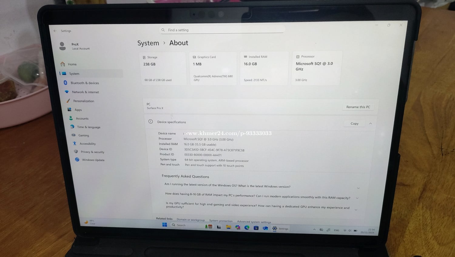 Surface Pro X black CPU : Microsoft SQ1 3.1GHz RAM : 16GB DDR4 SSD : 256GB ( Upgradable ) Screen : 13” 2.8K ( 2880 x 1920 ) VGA : Qualcomm(R) Adreno 680 Include Original Keyboard and adapter Weight less than 1Kg Touch Screen FaceID unlock Keyboard light Pen gen1 Case Back & Front Camera Price: 360$