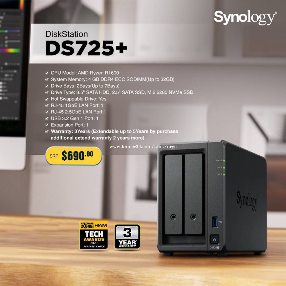 Synology DS725+ គឺជាដំណោះស្រាយ ដ៏ល្អ សម្រាប់ការប្រើប្រាស់ជាលក្ខណះ Home User or Small office ដែលអាចដាក់ HDD បានចំនួន២ គ្រាប់ និងអាចបង្កើនចំនួន Slot បានរហូតដល់ទៅ 5 HDD បន្ថែមទៀត។មិនតែប៉ុណ្ណោះម៉ូឌែលនេះ មានភ្ជាប់មកជា មួយ M.2 Drive Slots ចំនួន 2 Slots សម្រាប់ បន្ថែម M.2 ដែលនិងធ្វើ ឪ្យរាល់ការទាញយកឯកសារ ឫវីដេអូ ផ្សេងៗនៅលើ NASកាន់តែដំណើរការលឿន។ 📱 Phone: +855714600xxxClick To Call 📨 Telegram: https://t.me/linkforgetechnology 🌐 Website: www.linkforgetechnology.com 📧 Email: inf*@linkforgetechnology.comClick To Sent Email 💬 Facebook Page Inbox: LinkForge Technology 🛒 Delivery available nationwide 📍 Address: Phnom Penh, Cambodia