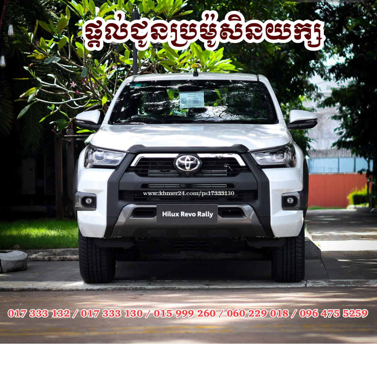 🎁 ឱកាសចំណេញ លេីចំណេញបានមកដល់ទៀតហេីយ អតិថិជនទាំងអស់ នឹងទទួលបានការផ្ដល់ជូនពិសេសដូចជា ៖ 📍 ផ្ដល់ជូនការប្ដូរប្រេងម៉ាស៊ីនមួយឆ្នាំពេញ 𝟒ដង ✅ 📍 ការហ្វ្រីដឹករថយន្ដដល់ទីតាំង គ្រប់𝟐𝟓 ខេត្តក្រុង ✅ 📍 ការប្រាក់ពិសេសត្រឹម 0.74% 📍 ផ្ដល់ជូនគូប៉ុង 1000$ សម្រាប់ការវៃដូរស៊េរី 📍ដល់ជូនសន្លឹកឆ្នោតដើម្បីចាប់យក Toyota Veloz និង Toyota Hilux Revo Rally ជាមួយនឹងកាតសាំង 8រង្វាន់ »» ការផ្តល់ជូនបន្ថែម 1️⃣ 𝐅𝐫𝐞𝐞 កំរាលជើង1ឈុត 2️⃣ 𝐅𝐫𝐞𝐞 ផ្លាកលេខភ្នំពេញ + ឈៀក4ឆ្នាំ (អត្តសញ្ញាណប័ណ្ណភ្នំពេញ) 3️⃣ ការធានាចេញពីរោងចក្រ 3ឆ្នាំរឺ10ម៉ឺនគីឡូ 4️⃣ 𝐅𝐫𝐞𝐞 ឆែកបច្ចេកទេសសម្រាប់ការយកទៅប្រើប្រាស់ ១ខែ ឬ១ពាន់គីឡូម៉ែត្រដំបូង សម្រាប់ព័ត៌មានលម្អិត សូមទំនាក់ទំនងផ្នែកលក់រថយន្ត៖ ☎️ 017333xxxClick To Call / 017333xxxClick To Call (𝐂𝐞𝐥𝐜𝐚𝐫𝐝) ☎️015999xxxClick To Call (𝐒𝐦𝐚𝐫𝐭) ☎️060229xxxClick To Call (𝐌𝐞𝐭𝐟𝐨𝐧𝐞) 👉 𝐓𝐞𝐥𝐞𝐠𝐫𝐚𝐦: https://t.me/Toyota_AWS1 👉 𝐓𝐞𝐥𝐞𝐠𝐫𝐚𝐦: https://t.me/toyota_aws 👉 KH24 : https://www.khmer24.com/Toyota-VIP 👉 𝗪𝗲𝗯𝘀𝗶𝘁𝗲 : https://www.toyota.com.kh/en.html
