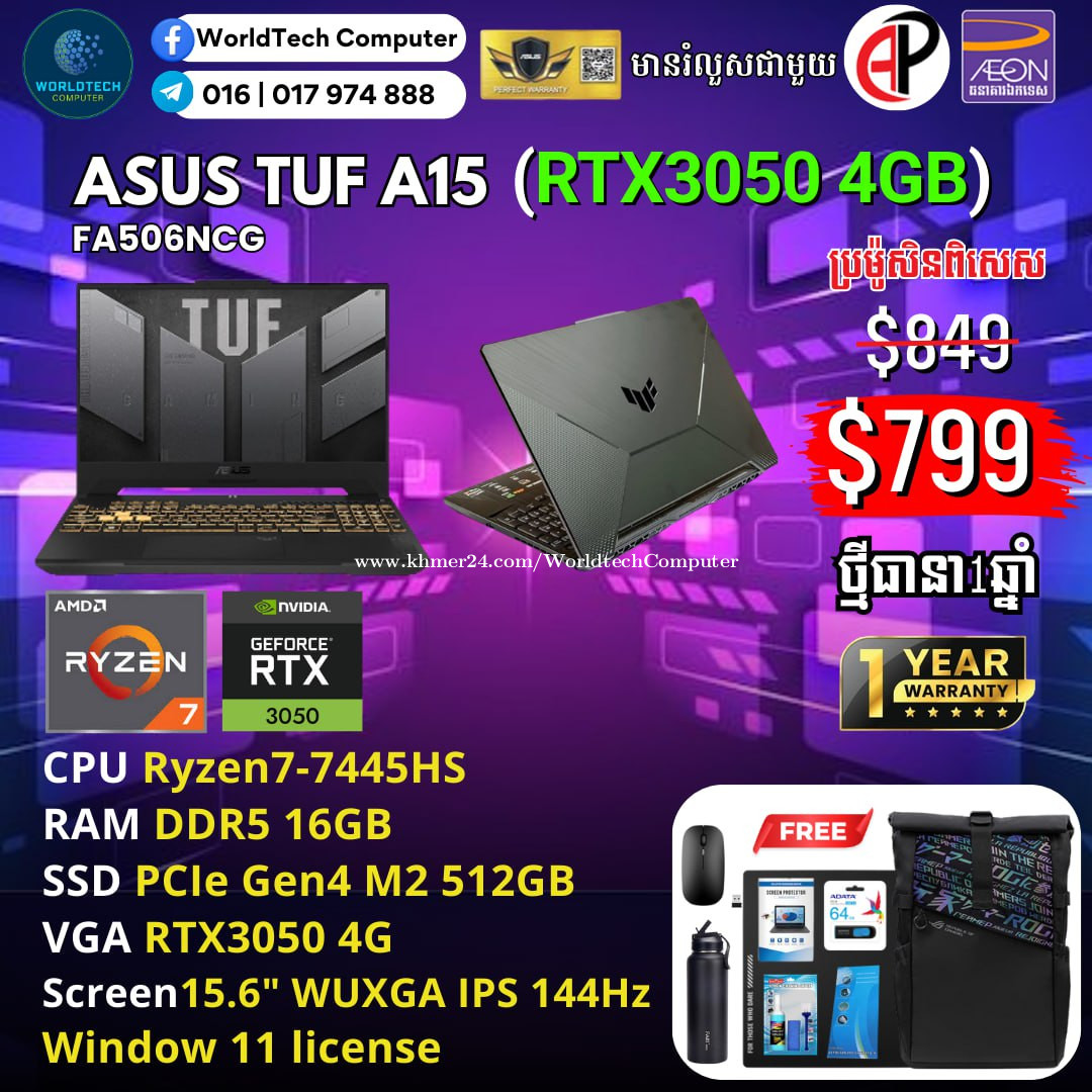 TUF A15 Ryzen7-7445HS RAM DDR5 16G M2 512G RTX3050 4G 15.6" 144Hz New=799$ ថ្មីកេស ធានា១ឆ្នាំពីក្រុមហ៊ុន ថែមជូនការដូរ 8មុខ និងបិតអេក្រង់ជូន Telegram: 017974xxxClick To Call , 011777xxxClick To Call