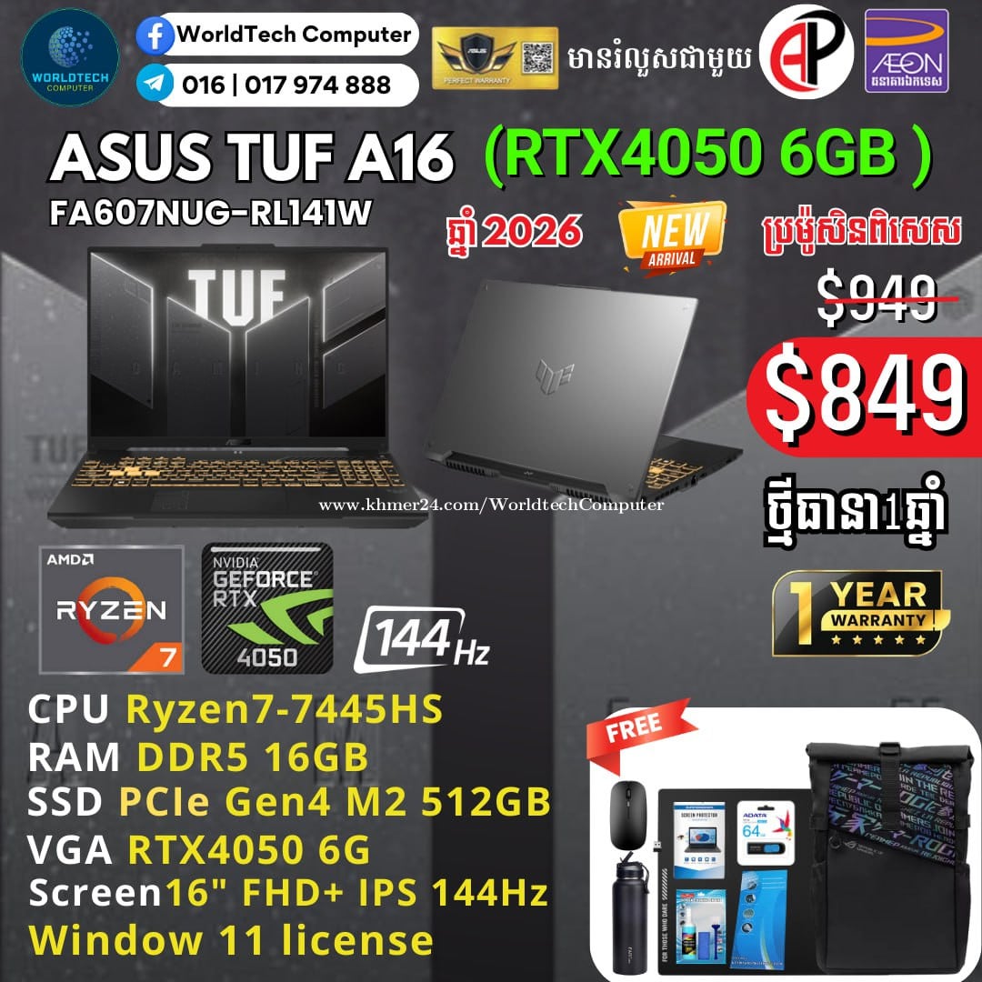 New TUF A16 TUF A16 Ryzen7-7445HS 16G M2 512GB RTX4050 6G 16" 144Hz New=849$ ថ្មីប្រអប់ ធានាជូន១ឆ្នាំ (Warranty 1year) Telegram: 017974xxxClick To Call , 011777xxxClick To Call ទីតាំងហាង: ផ្ទះ39Eo ផ្លូវ257 ទឹកល្អក់3 ទួលគោក ភ្នំពេញ (ខាងលិចស្តុបទេពផនប្រហែល 300ម)។ Location: #39E0 St257, Tuol Kouk , Tuek L'ak Bei , Phnom Penh