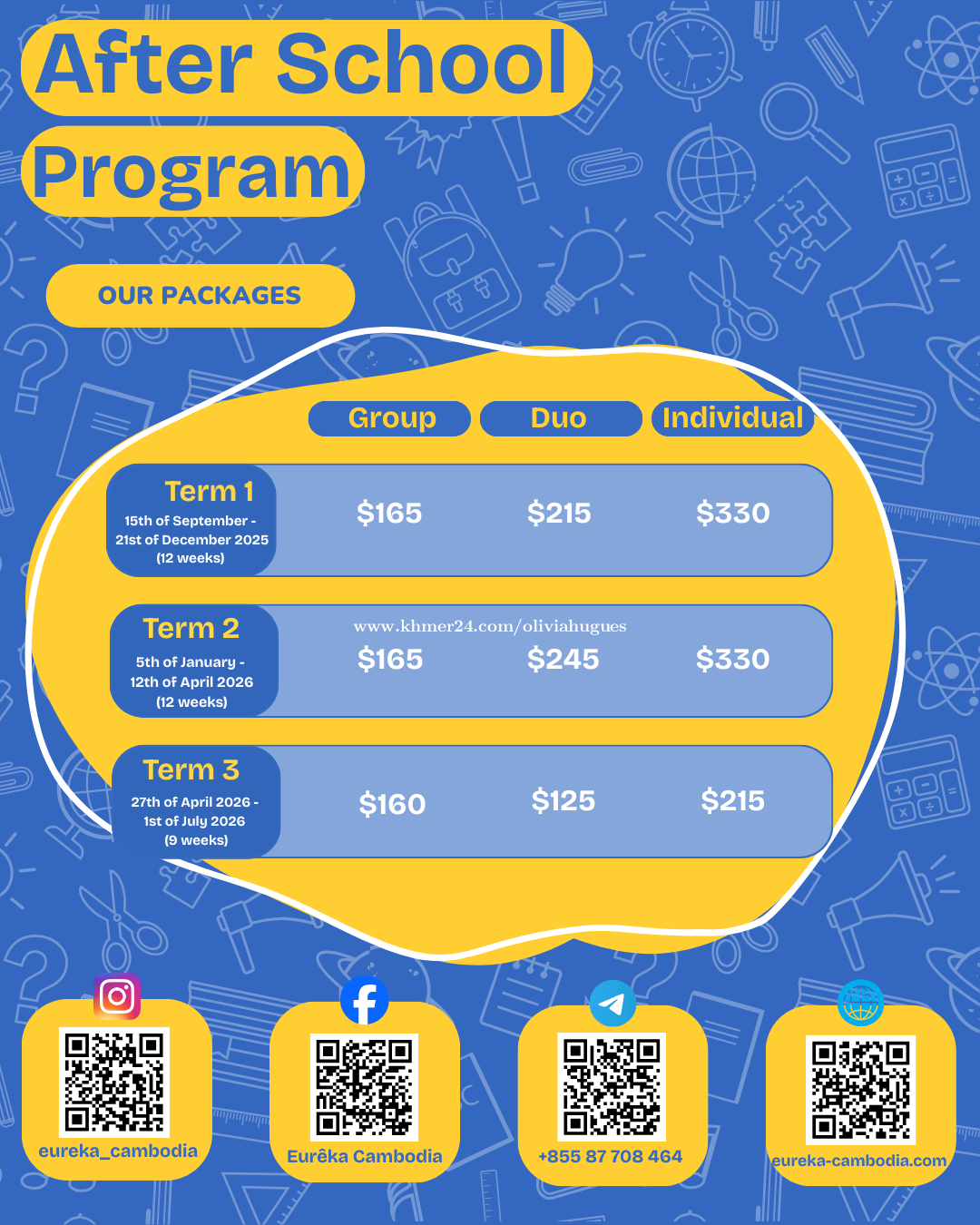 Eurรชka is a tutoring center, a language school, and a consulting company based in Phnom Penh. โจ What we do: ๐ง Help children succeed at school. ๐ Help university students master languages. ๐ข Help companies implement effective language solutions. Follow us or contact us for more information: ๐ 48 Street 84, Neary Klahan (St. 84), Phnom Penh ๐ +8558770xxxClick To Call4 (French, Khmer, English) ๐ฉ tea*@eureka-cambodia.comClick To Sent Email ๐ www.eureka-cambodia.com ๐ฅ Social Media : Facebook : https://www.facebook.com/eurekacambodia/ Instagram : https://www.instagram.com/eureka_cambodia/ Linkedin : https://www.linkedin.com/notifications/?filter=all Tiktok : https://www.tiktok.com/@eurekacambodia