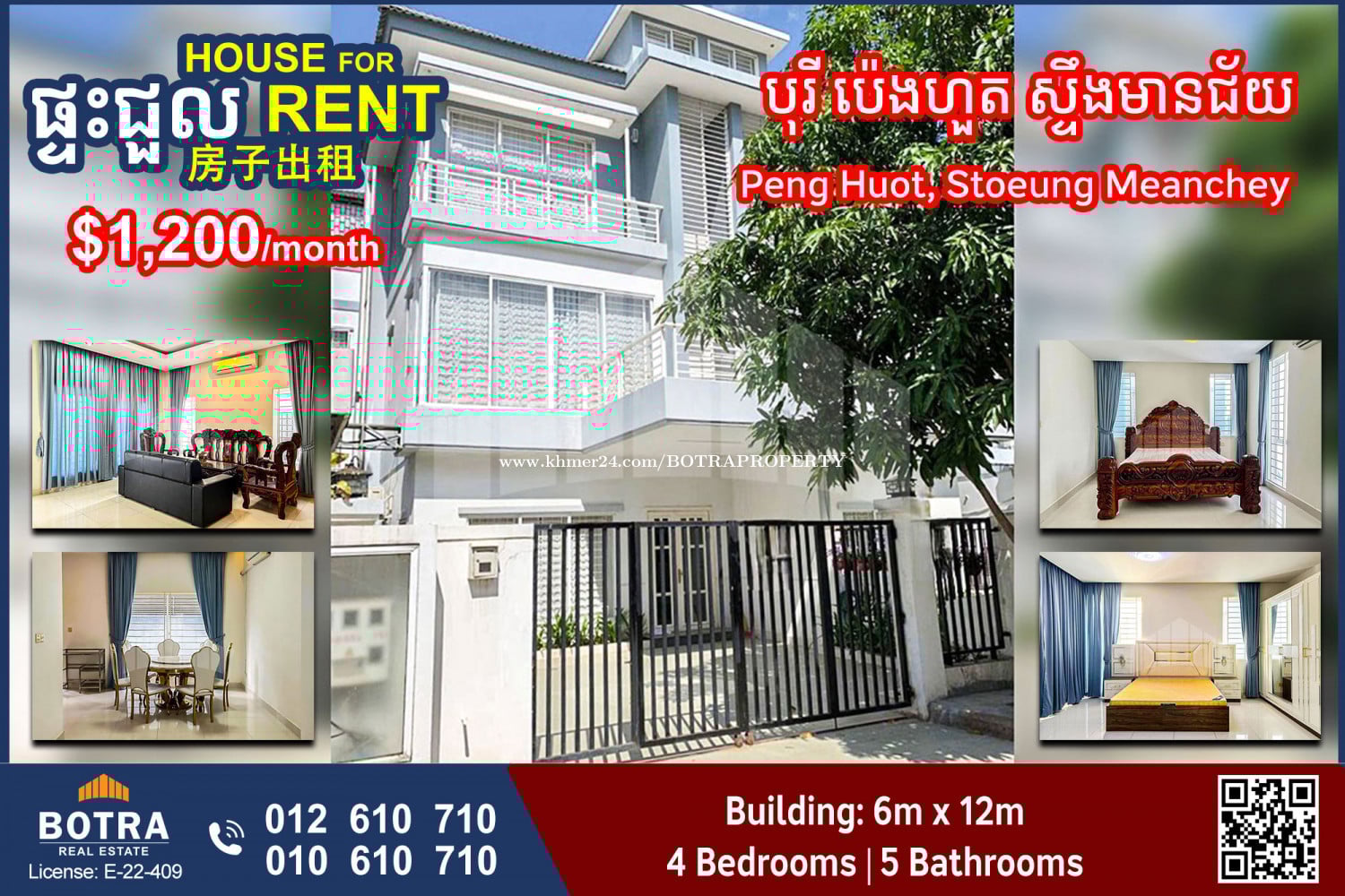 ๐ก Twin Villa for Rent #P1383 ๐ Borey Peng Huot, Stoeung Meanchey ๐ Price: $1,200/month (nego) - Villa Size: 6m x 12m - 4 Bedrooms | 5 Bathrooms - Fully Furnished โโโโโโโโโ Contact us now ๐ 012610xxxClick To Call (Cellcard) ๐ 010610xxxClick To Call (Smart) โถ๏ธ t.me/BotraRealEstate (Chat)