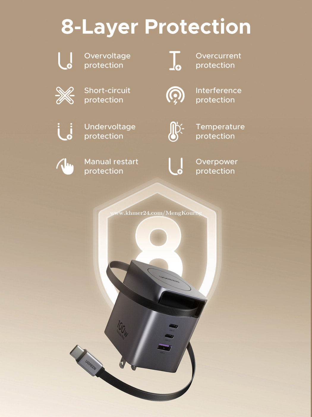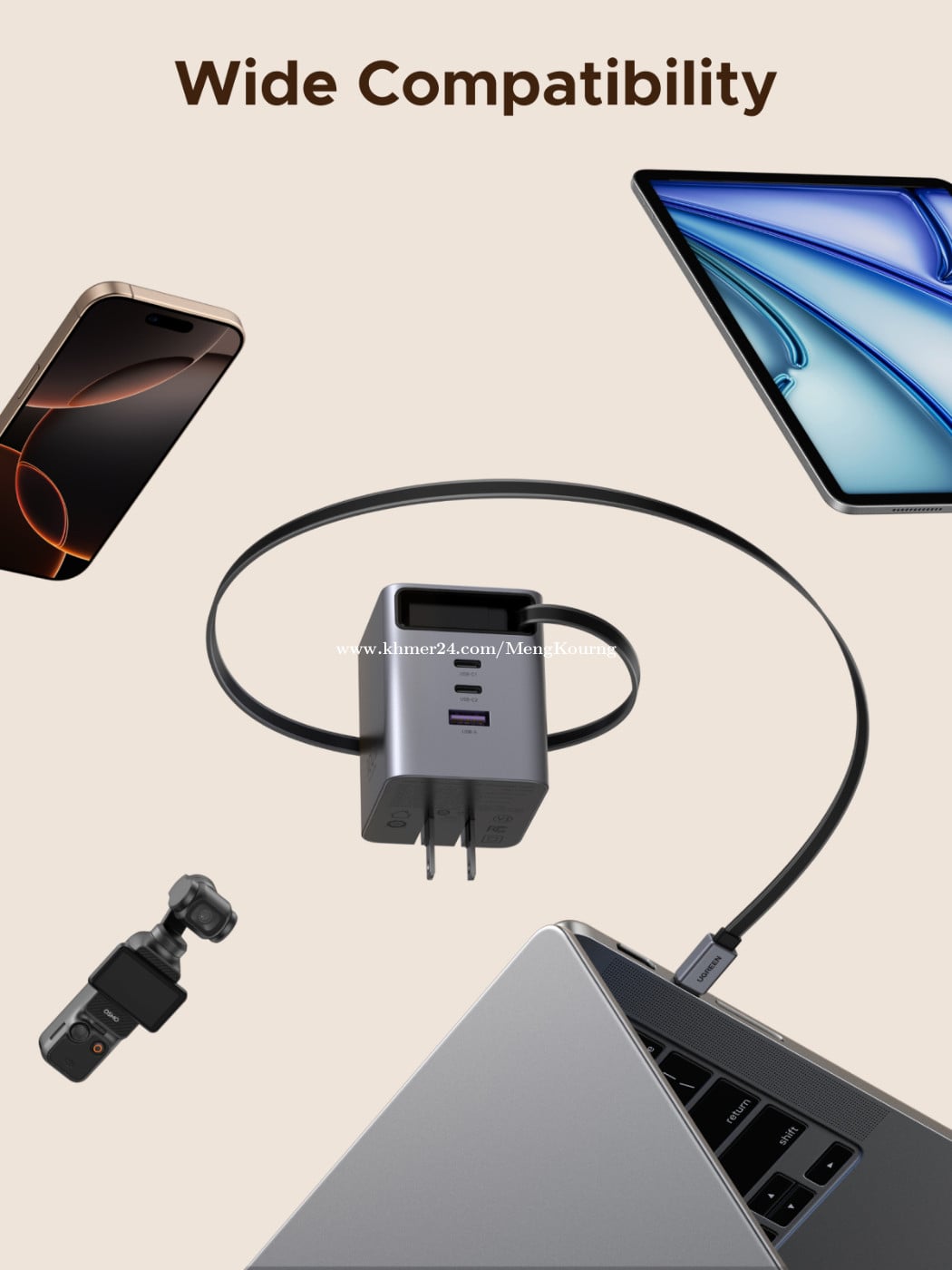 UGREEN 100W GaN Fast Charger with Retractable Cable 65827 ✅ Input 100~240V AC, 50/60 Hz, maximum 1.8 amperes ✅ USB output USB-C cable: 5V/3A, 9V/3A, 12V/3A, 15V/3A, 20V/5A, 100W Max PPS: 5-21V/5A (PDO broadcast) ✅USB-C1:5V/3A 、9V/3A 、12V/3A 、 15V/3A 、20V/5A 100W Max PPS:5-21V/5A (PDO) ✅USB-C2:5V/3A 、9V/3A 、12V/2.5A 、15V/2A 、20V/1.5A 30W Max PPS:5-11V/2.75A (PDO) ✅USB-A: 5V/3A 、9V/2A 、12V/1.5A 、 10V/2.25A 22.5W Max ✅ Output total power: 100W Max ✅ Output voltage range ±5% of the rated voltage ✅ Output ripple: 5V ≤ 150mV, 9V ≤ 150mV, 12V ≤ 180mV, 15V ≤ 180mV, 20V ≤ 200mV 👍2 YEAR WARRANTY *This price not include delivery 🛒កម្ម៉ង់ឥឡូវនេះ 👇👇👇 ផ្នែកលក់ 012787xxxClick To Call https://t.me/cmksale1 Join ⏬ Telegram 🔔 https://t.me/+pMlYdQSBYkEyYTU1 ដើម្បីទទួលបាន ព័ត៌មានថ្មីៗ លម្អិត និងការផ្តល់ជូនពិសេសៗ ពីជួម៉េងគួងកុំព្យូទ័រ 🌐cmkcomputer.com 🌐https://www.facebook.com/MengKourngComputer 🌐https://www.facebook.com/cambodiafantech