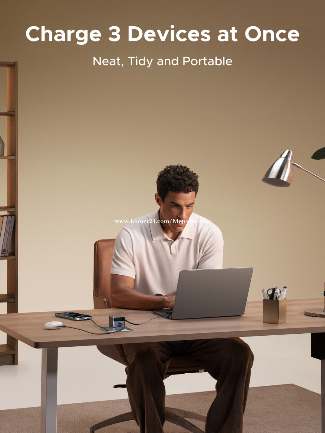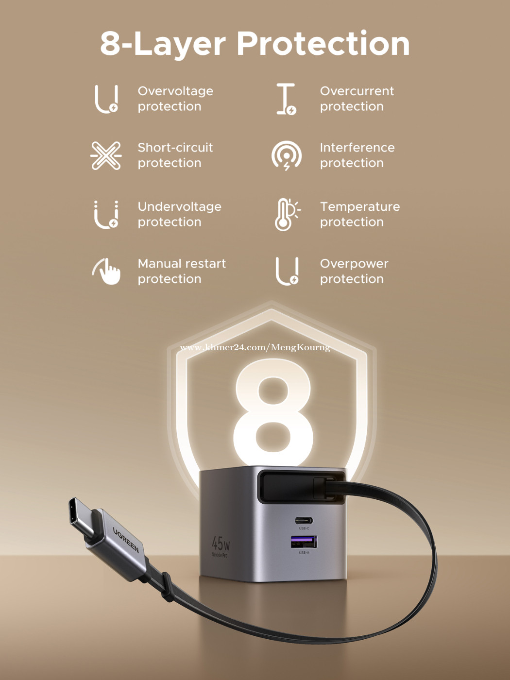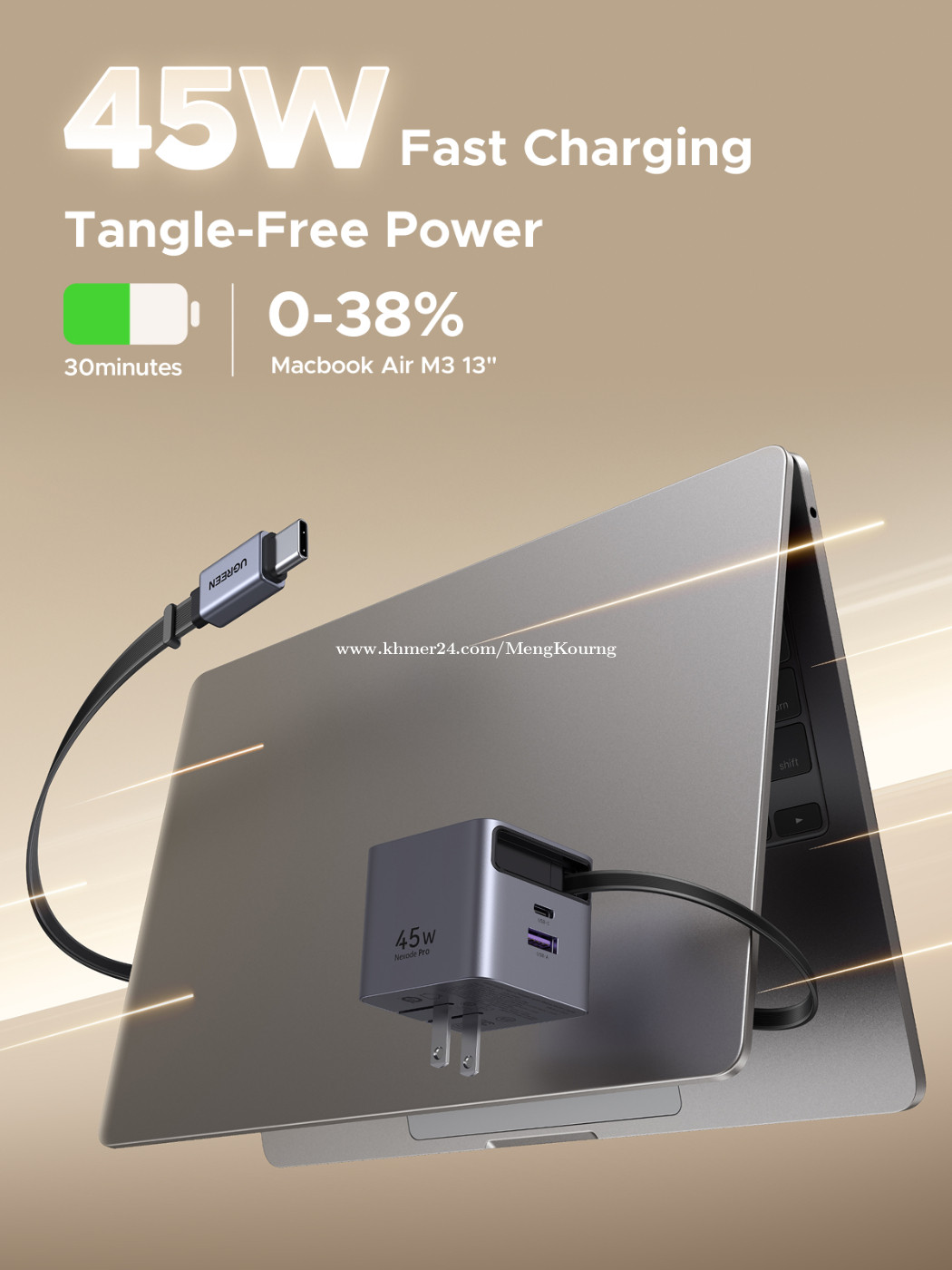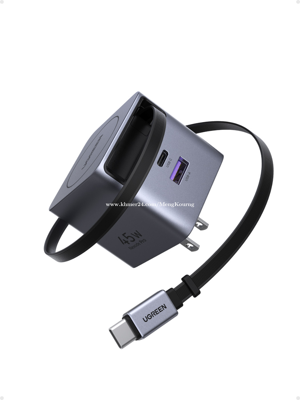 UGREEN 45W GaN Fast Charger with Retractable Cable 65821 * AC input: 100~240Vac, 50Hz, 1.2A Max * USB output:USB-C1 Cable:5V/3A 、9V/3A 、12V/3A 、15V/3A 、20V/2.25A 45W Max PPS:5-11V/2.75A USB-C2:5V/3A 、9V/3A 、12V/3A 、15V/3A 、20V/2.25A 45W Max PPS:5-11V/4.5A USB-A: 5V/3A 、9V/2A 、12V/1.5A 、 10V/2.25A 22.5W Max Multiple outputs can be seen in the power distribution table. * Output Total Power: 45W Max * C1 Extension Line Length: 0.7 meters 👍2 YEAR WARRANTY *This price not include delivery 🛒កម្ម៉ង់ឥឡូវនេះ 👇👇👇 ផ្នែកលក់ 012787xxxClick To Call https://t.me/cmksale1 Join ⏬ Telegram 🔔 https://t.me/+pMlYdQSBYkEyYTU1 ដើម្បីទទួលបាន ព័ត៌មានថ្មីៗ លម្អិត និងការផ្តល់ជូនពិសេសៗ ពីជួម៉េងគួងកុំព្យូទ័រ 🌐cmkcomputer.com 🌐https://www.facebook.com/MengKourngComputer 🌐https://www.facebook.com/cambodiafantech