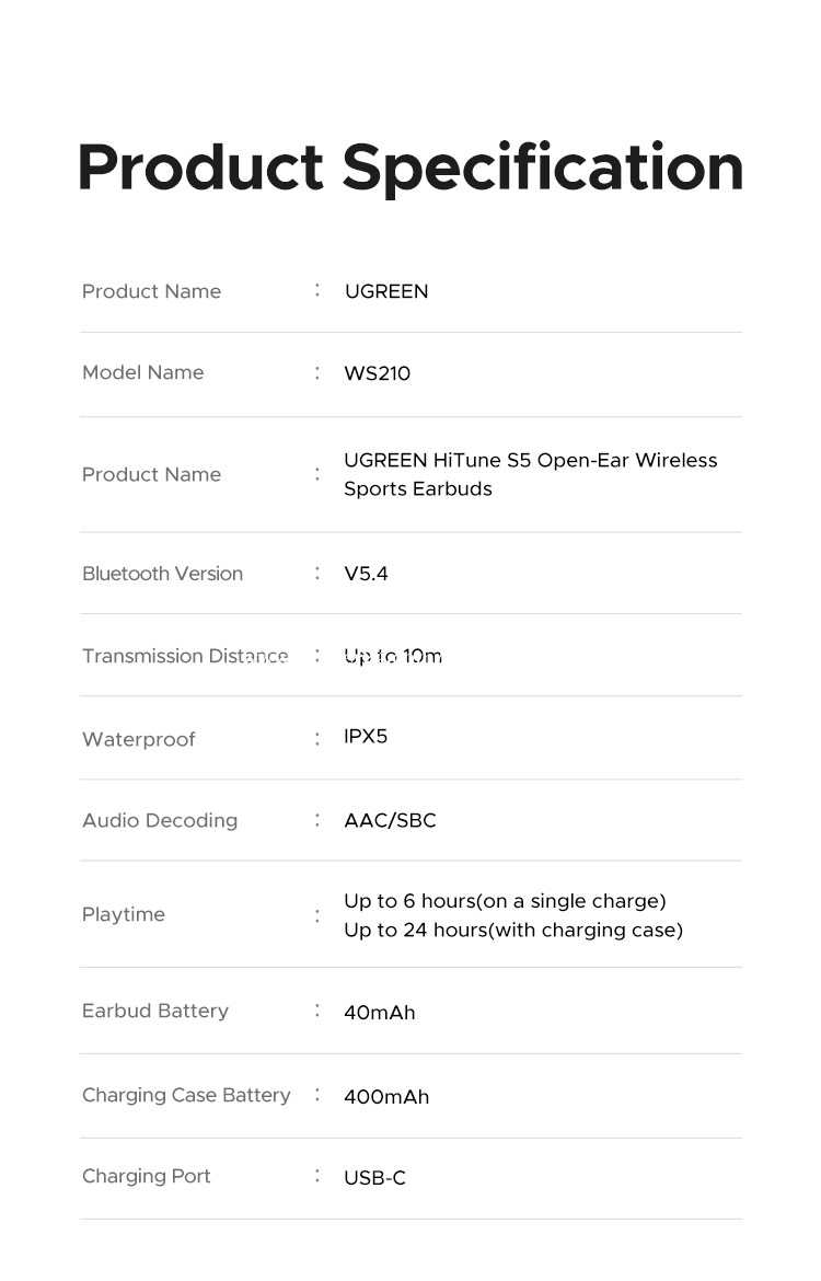 UGREEN HiTune S5 True Wireless Earbuds ✅ Bluetooth 5.4, Range: 10m, Frequency: 2400MHz-2483.5MHz ✅AI-powered Noise-free Calls ✅2 microphones, Ipx5 waterproof ✅12MM Bio-Diaphragm Dynamic Speaker ✅Around 80ms Ultra Low Latency ✅New comfortable And Stable Wear, a new way of wearing earbuds, relying on ear clamping, it is comfortable and stable ✅Air cushion structure, comfortable wear ✅Max.RF Output Power: 4dBm ✅Bluetooth Profile: HFP/AVRCP/A2DP/BLE/SPP ✅Codec: AAC, SBC ✅Frequency Response: 20Hz-20kHz ✅Operating Time: 6h music play on a single charge: 24h music play with charging case ✅Charging Port: USB-C, Capacity: Earbuds:40mAh 3.7V (0.148Wh) About 1.5 hours Charging Case:400mAh 3.7V (1.48Wh) About 2 hours Color Black White 👍1 years warranty *This price not include delivery 🛒កម្ម៉ង់ឥឡូវនេះ 👇👇👇 ផ្នែកលក់ 012787xxxClick To Call https://t.me/cmksale1 Join ⏬ Telegram 🔔 https://t.me/+pMlYdQSBYkEyYTU1 ដើម្បីទទួលបាន ព័ត៌មានថ្មីៗ លម្អិត និងការផ្តល់ជូនពិសេសៗ ពីជួម៉េងគួងកុំព្យូទ័រ 🌐cmkcomputer.com 🌐https://www.facebook.com/MengKourngComputer 🌐https://www.facebook.com/cambodiafantech