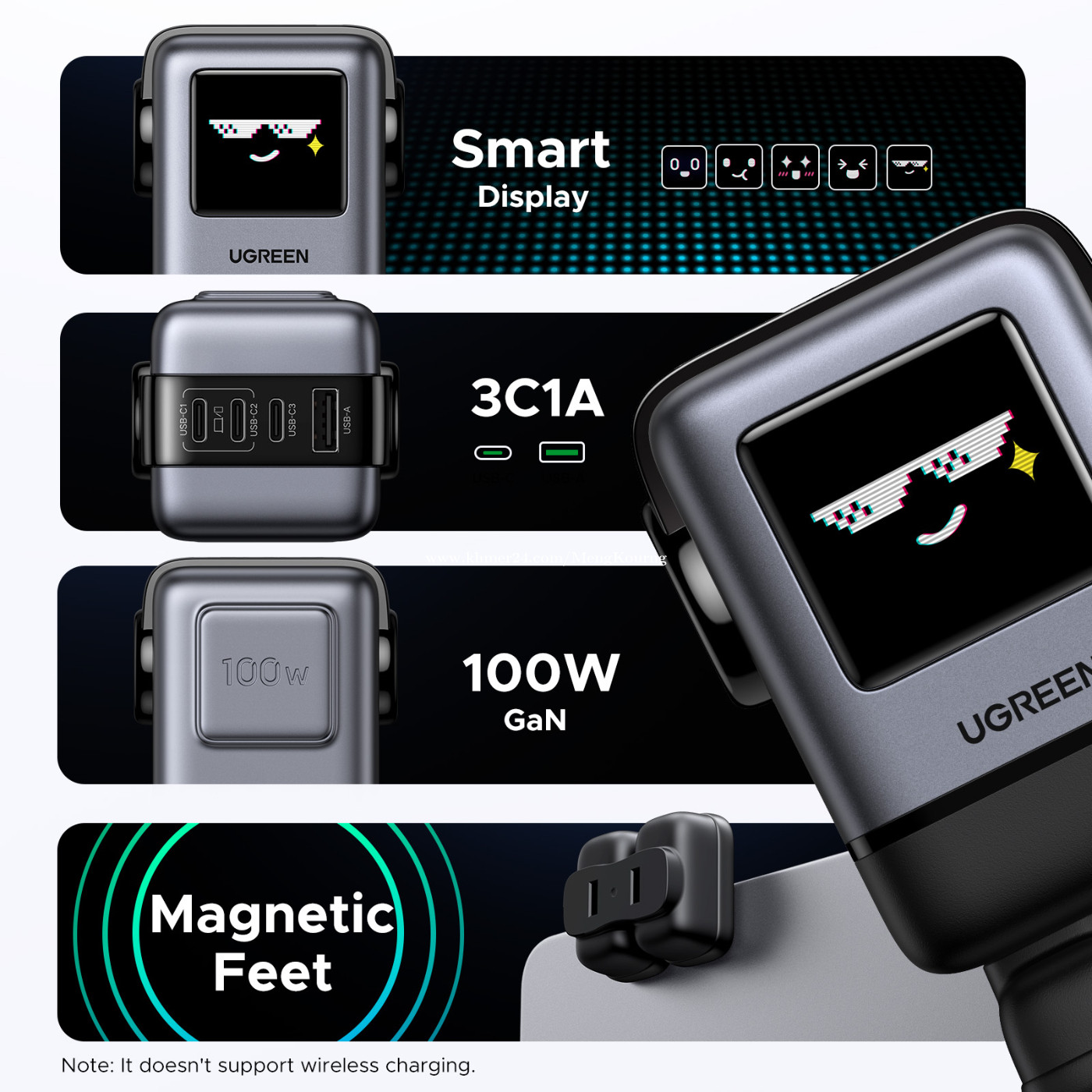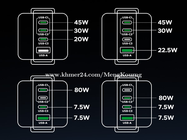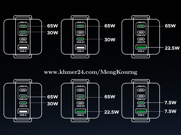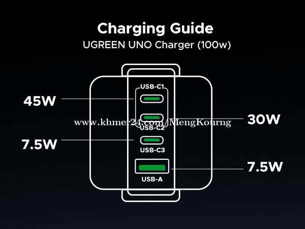 UGREEN Uno 100W 4-Port GaN Fast Charger US 45514B ✅Input: 100-240V~ 50/60Hz 1.8A Max ✅USB-C1/USB-C2 Output: 5.0V=3.0A 9.0V=3.0A 12.0V=3.0A 15.0V=3.0A 20.0V=5.0A 100.0W Max ✅USB-C3 Output 5.0V=3.0A 9.0V=3A 12.0V=2.5A 15V=2.0A 20V=1.5A 30W Max ✅USB-A Output: 5.0V=3A 9.0V=2.0A 12.0V=1.5A 10.0V=2.25A 22.5W Max ✅Compatible with: PD3.0(PD2.0) /QC4+(QC4.0 QC3.0 QC2.0)/PPS/AFC/APPLE 5V2.4A/BC1.2 ✅Total Output:100W Max 👍2 year warranty *This price not include delivery 🛒កម្ម៉ង់ឥឡូវនេះ 👇👇👇 ផ្នែកលក់ 012787xxxClick To Call https://t.me/cmksale1 Join ⏬ Telegram 🔔 https://t.me/+pMlYdQSBYkEyYTU1 ដើម្បីទទួលបាន ព័ត៌មានថ្មីៗ លម្អិត និងការផ្តល់ជូនពិសេសៗ ពីជួម៉េងគួងកុំព្យូទ័រ 🌐cmkcomputer.com 🌐https://www.facebook.com/MengKourngComputer 🌐https://www.facebook.com/cambodiafantech