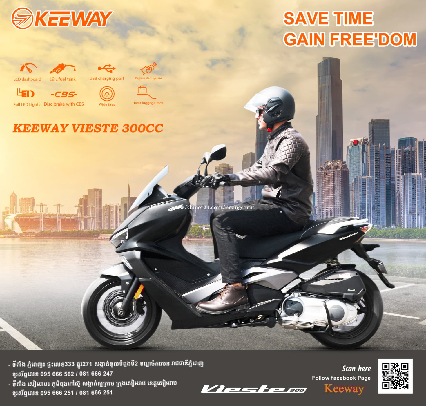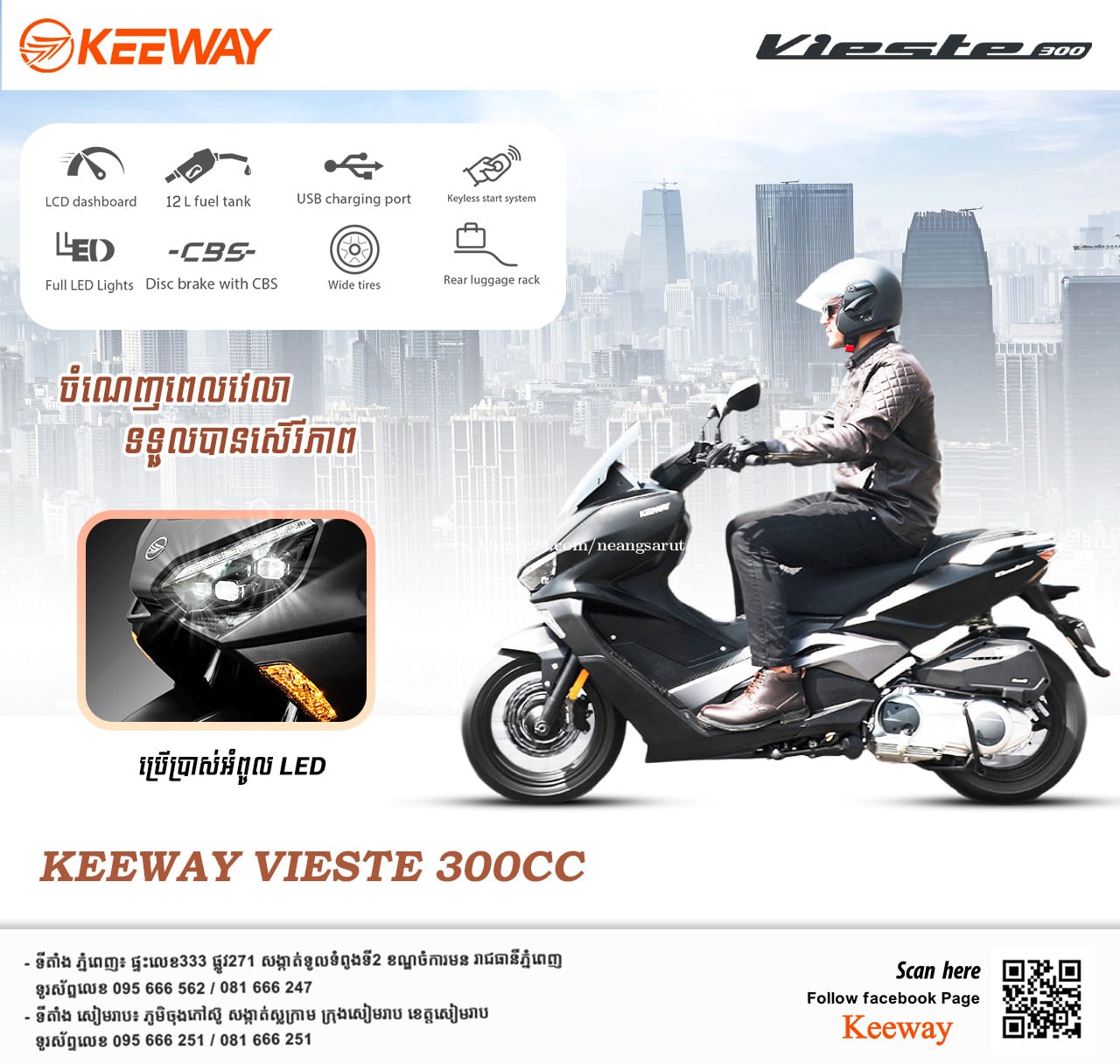 Keeway Vieste300 CC ឆ្នាំ2023 ថ្មីក្រដាសពន្ធសល់ 7 គ្រឿង មាន ខ្មៅ សរ ខៀវ បញ្ចុះសល់ 3,500$ ចរចា ធានាម៉ាសុីន3ឆ្នាំ ------------------------------ Keeway Vieste300 CC 2023, new, tax papers, 7 units, black, white, blue Discount remaining 3,500$ negotiate , 3-year engine warranty https://t.me/Suiiwey