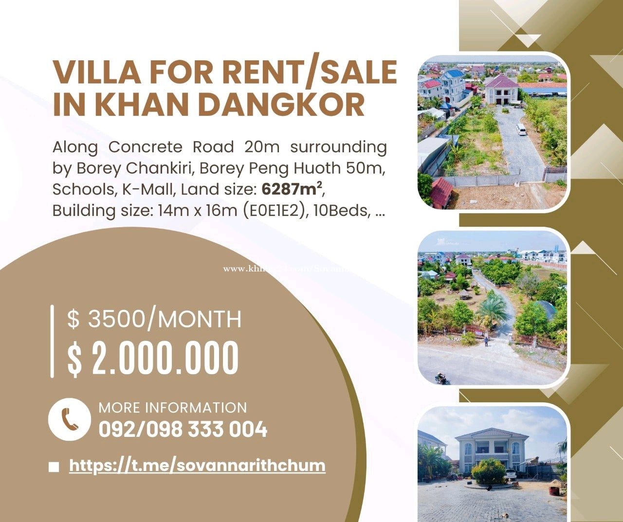๐ก แแธแกแถแแแแพแ แแแแแถแแแแฝแ/แแแ โ แแธแแถแแแแแขแแแแปแ แแถแแแแแแผแแแแนแ 20m แแทแ แแทแแแปแแธ & แแถแแถแแแ โจ แแถแแแแแแแแถแแแแแแฝแแถแ แฌแแทแแทแแแ (Guesthouse/Office) โ แแธ: 6,287 sqm โ แแแ แแขแแถแ: 14m x 16m (E0E1E2) โ แแแแแแแแทแแแ: แแแแแแแแแ 10 | แแแแแแแแนแ 10 | แแแแแแถแ 2 | แแแแแแแแแฝแแแแแแ | แแแแแแแแแทแแแแขแถแ แถแ | แแฝแแ แแแถแ ๐ฟ ๐ฐ แแแ: $2,000,000 | แแฝแ: $3,500/แแ ๐ฉ แแผแ Inbox แฌแแแแถแแแแแแ: 098/092/068333xxxClick To Call ๐ Telegram: https://t.me/sovannarithchum ๐ฌ๐ง English ๐ก Modern Villa for Rent / Sale โ prime location along a 20m street, near Borey & School โจ perfect for families or investment (guesthouse/office). โ Land size: 6,287 sqm โ Building size: 14m x 16m (E0E1E2) โ Features: 10 Bedrooms | 10 Bathrooms | 2 Kitchens | Living Room | Dining Room | Garden ๐ฟ ๐ฐ For Sale: $2,000,000 | For Rent: $3,500/month ๐ฉ DM us or call: 098/092/068333xxxClick To Call ๐ Telegram: https://t.me/sovannarithchum ๐จ๐ณ ไธญๆ๏ผ็ฎไฝ๏ผ ๐ก ็ฐไปฃๅซๅข ๅบ็ง/ๅบๅฎ๏ฝ้ป้ๅฐๆฎต๏ผไธด20็ฑณไธป่ทฏ๏ผ้ ่ฟBorey็คพๅบไธๅญฆๆ ก โจ ้ๅๅฎถๅบญๅฑ ไฝๆๆ่ต๏ผๆฐๅฎฟ/ๅๅ ฌ๏ผใ โ ๅๅฐ้ข็งฏ๏ผ6,287 ๅนณๆน็ฑณ โ ๅปบ็ญๅฐบๅฏธ๏ผ14m x 16m๏ผE0E1E2๏ผ โ ้ ๅฅ๏ผ10ๅง | 10ๅซ | 2ไธชๅจๆฟ | ๅฎขๅ | ้คๅ | ่ฑๅญ ๐ฟ ๐ฐ ๅฎไปท๏ผ$2,000,000๏ฝ็ง้๏ผ$3,500/ๆ ๐ฉ ็งไฟกๅจ่ฏขๆ่ด็ต๏ผ098/092/068333xxxClick To Call ๐ Telegram: https://t.me/sovannarithchum