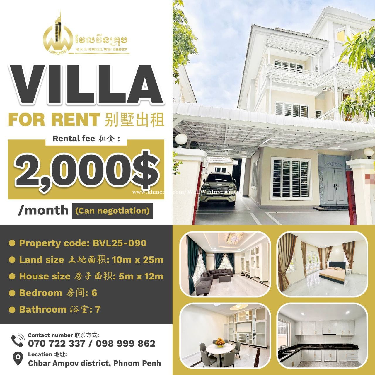 Villa for rent Property code: BVL25-090 Rental 租金: 2,000$ (Can negotiation) Land size 土地面积: 10m x 25m House size 房子面积: 5m x 12m Bedroom 房间: 6 Bathroom 浴室:7 Location 地址: Chbar Ampov district, Phnom Penh Contact number 联系方式: 070722xxxClick To Call /098999xxxClick To Call