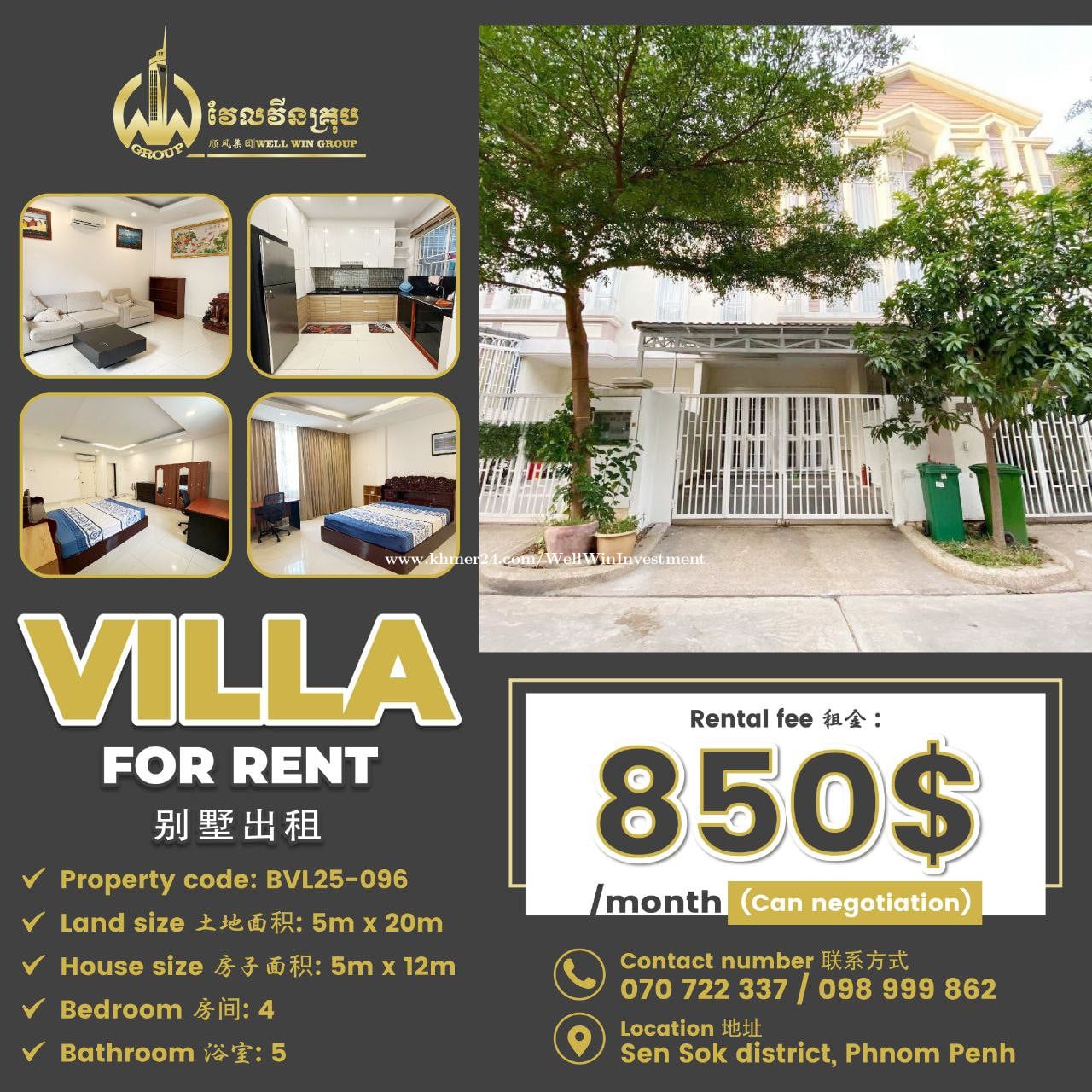 Villa for rent Property code: BVL25-096 Rental 租金: 850$ (Can negotiation) Land size 土地面积: 5m x 20m House size 房子面积: 5m x 12m Bedroom 房间: 4 Bathroom 浴室:5 Location 地址: Sen Sok district, Phnom Penh Contact number 联系方式: 070722xxxClick To Call / 098999xxxClick To Call