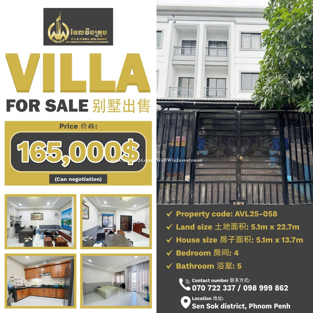 Villa for sale 别墅出售 Property code: AVL25-058 Price 价格: 165,000$ (Can negotiation) Land size 土地面积: 5.1m x 22.7m House size 房子面积: 5.1m x 13.7m Bedroom 房间: 4 Bathroom 浴室: 5 Location 地址: Sen Sok district, Phnom Penh Contact number 联系方式:070722xxxClick To Call / 098999xxxClick To Call