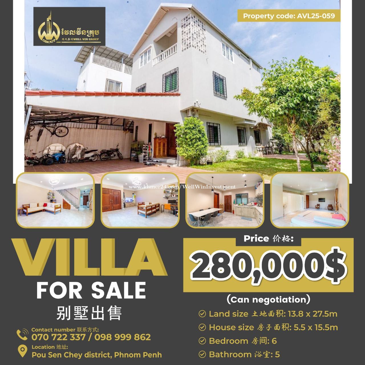 Villa for sale 别墅出售 Property code: AVL25-059 Price 价格: 280,000$ (Can negotiation) Land size 土地面积: 13.8 x 27.5m House size 房子面积: 5.5 x 15.5m Bedroom 房间: 6 Bathroom 浴室: 5 Location 地址: Pou Sen Chey district, Phnom Penh Contact number 联系方式:070722xxxClick To Call / 098999xxxClick To Call
