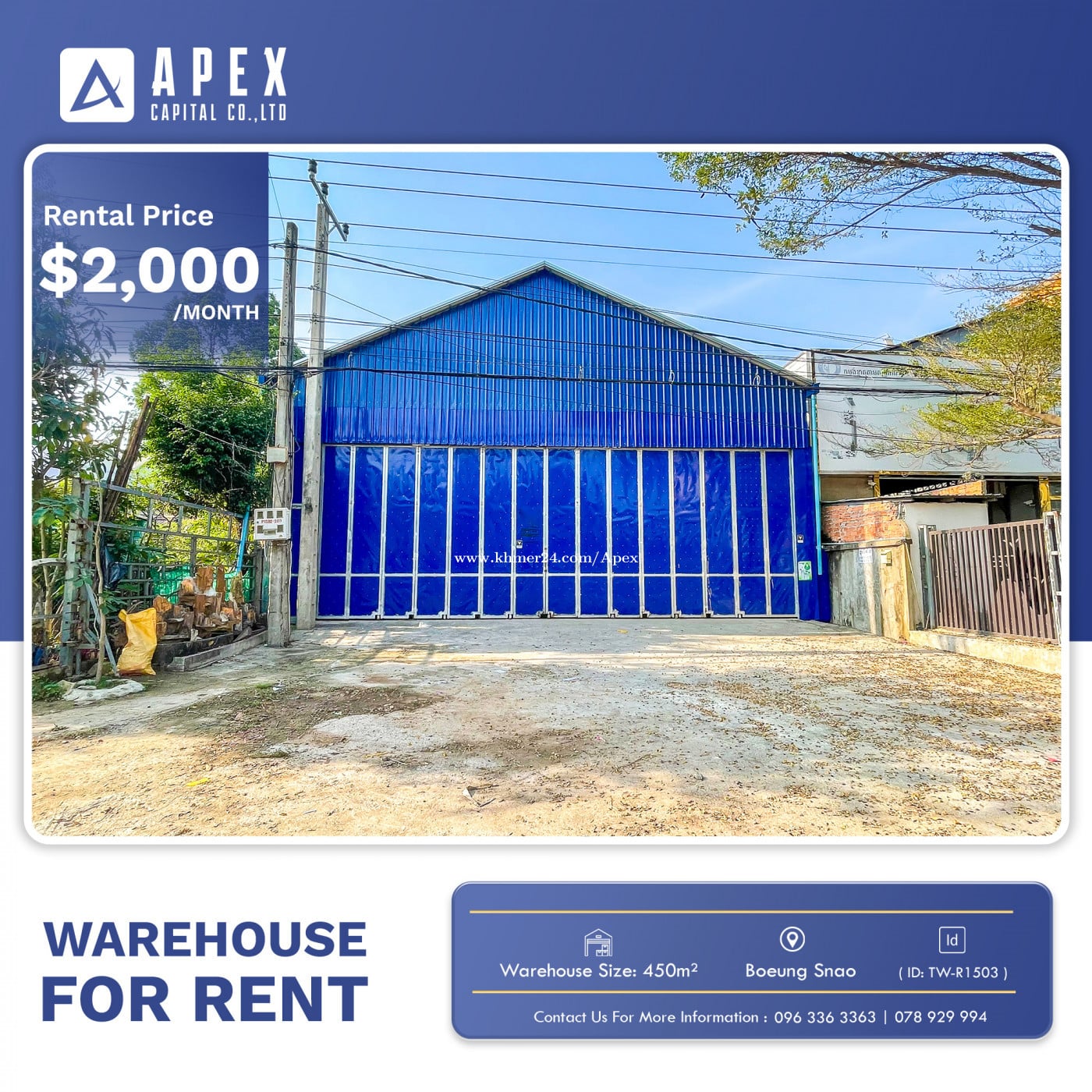 - ឃ្លាំងសម្រាប់ជួល - បឹងស្នោរ - តម្លៃ 2000$ ចរចា - ទំហំឃ្លាំង 450m2 - ការិយាល័យ ៖ 1 - បន្ទប់ទឹក ៖ 1 ——————————————-- [Warehouse For Rent][仓库出租] 📍LOCATION/位置 Boeng Snoa 🌟 Price/租金 $2,000/month • Property ID: TW-R1503 - Land Size/土地面积: m x m - Warehouse Size/仓库面积: 450m² - Office/办公室: 1 - Bathroom/浴室: 1
