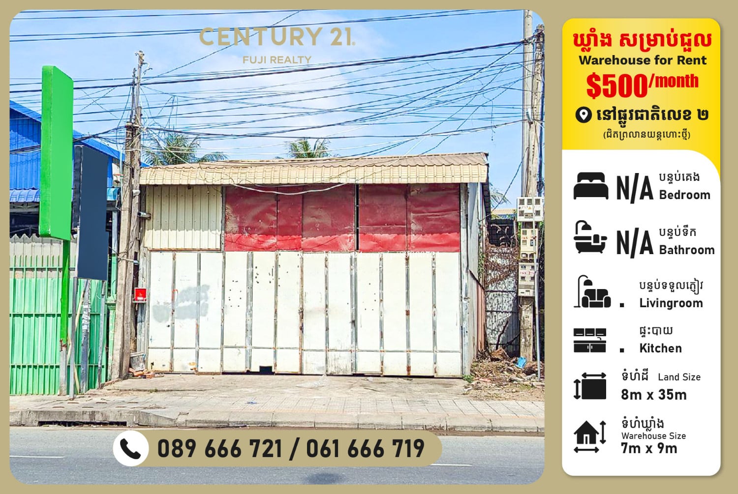 Warehouse for rent at road 2 ( Near new airport) - Rent Price: US$500/month - House Size: 7m x 9m - Land Size: 8m x 35m - Bathrooms: 1 Contact for Viewing or More Information: - Tel: 098675xxxClick To Call / 017946xxxClick To Call / 061666xxxClick To Call - Telegram: https://t.me/epheakdey_fujirealty - Channel: https://t.me/pheakdey_realtor License No.: E-14-160