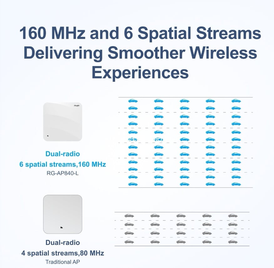 អត្ថប្រយោជន៍សំខាន់ៗរបស់ Ruijie AP840-L 1.ល្បឿនខ្ពស់ និងឥទ្ធិពលបន្ថែមពី Wi-Fi 6 (802.11ax) មានកម្រិតទិន្នន័យសម្របសម្រួលរហូតដល់ 5.378 Gbps សម្រាប់ dual-band (2.4 GHz + 5 GHz) ។ 2.អាចទ្រាំទ្រអ្នកលេងបានច្រើន និយាយរួមក្នុងមួយ AP បានដល់ 1024 clients 3. សុវត្តិភាពកម្រិតខ្ពស់ គាំទ្រ WPA3, ស្ថាបនាជាមួយនូវ wireless encryption ជំនាន់បន្ទាន់ ដើម្បីធានាសុវត្ថិភាពខ្ពស់នៅលើតំណភ្ជាប់បណ្តាញ Wi-Fi ។