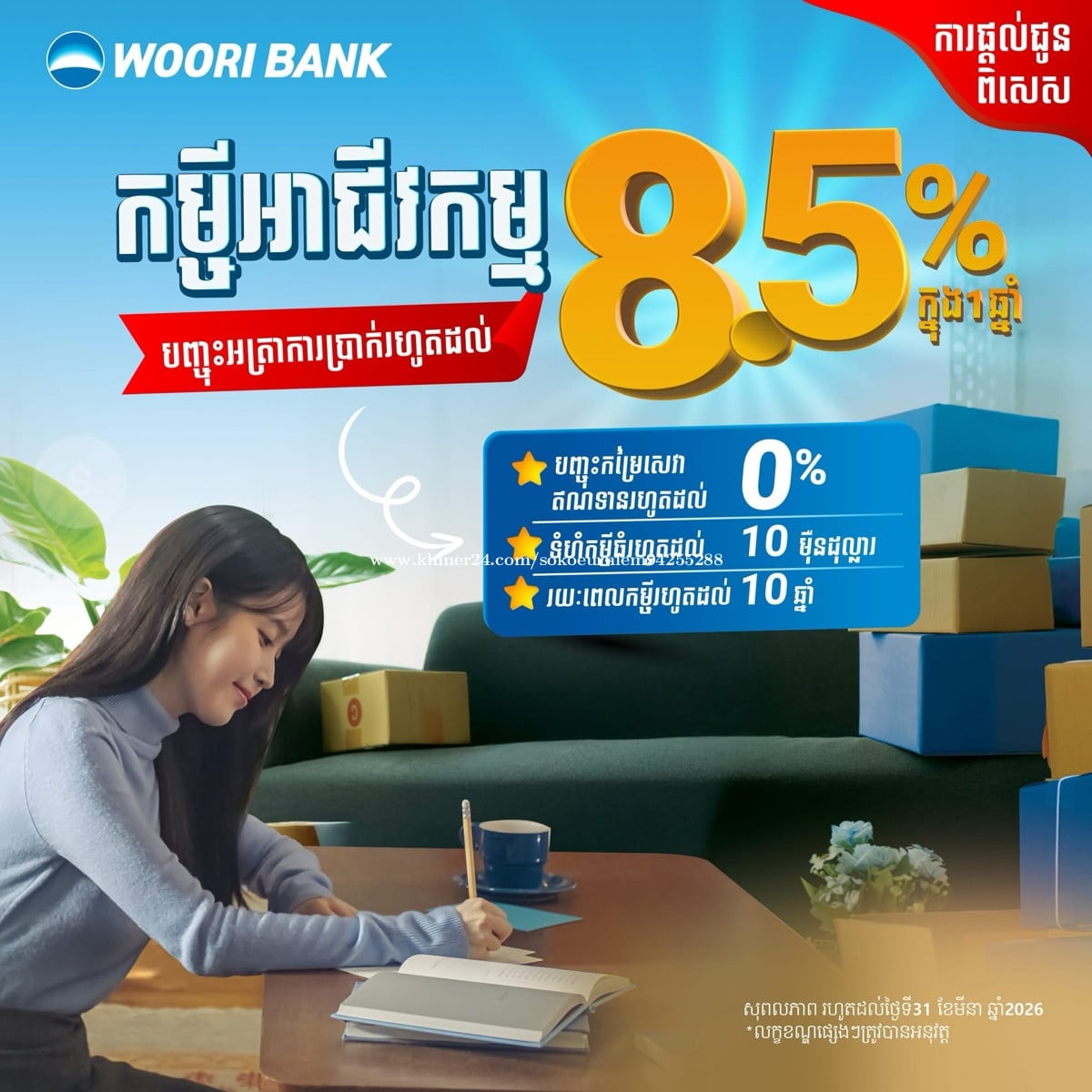 ពង្រីកអាជីវកម្មរបស់អ្នកជាមួយធនាគារ អ៊ូរី ជាមួយការផ្តល់ជូនអត្រាការប្រាក់ទាបចាប់ពី 8.5% ក្នុងមួយឆ្នាំ ជាមួយនឹងអត្ថប្រយោជន៍ជាច្រើនទៀតដូចជា៖ 🎉 បញ្ចុះកម្រៃសេវាឥណទានរហូតដល់ 0% 📈 ទំហំកម្ចីរហូតដល់ 100,000$ 📆 រយៈពេលកម្ចីរហូតដល់ 10ឆ្នាំ 📅ការផ្តល់េជូននេះ មានសុពលភាពរហូតដល់ថ្ងៃទី 31 ខែមីនា ឆ្នាំ 2026 Boost your business with a business loan from Woori Bank, offering exclusive benefits such as: • 💰 Low interest rates of up to 8.50% per annum • 🎉 Loan fees reduced by up to 0% • 📈 Loan amounts available up to $100,000 • 📆 Flexible loan terms of up to 10 years 📅 This offer is valid from today until March 31, 2026. ទំនាក់ទំនងលេខទូរសព្ទ & Telegram 095202xxxClick To Call/0313181xxxClick To Call