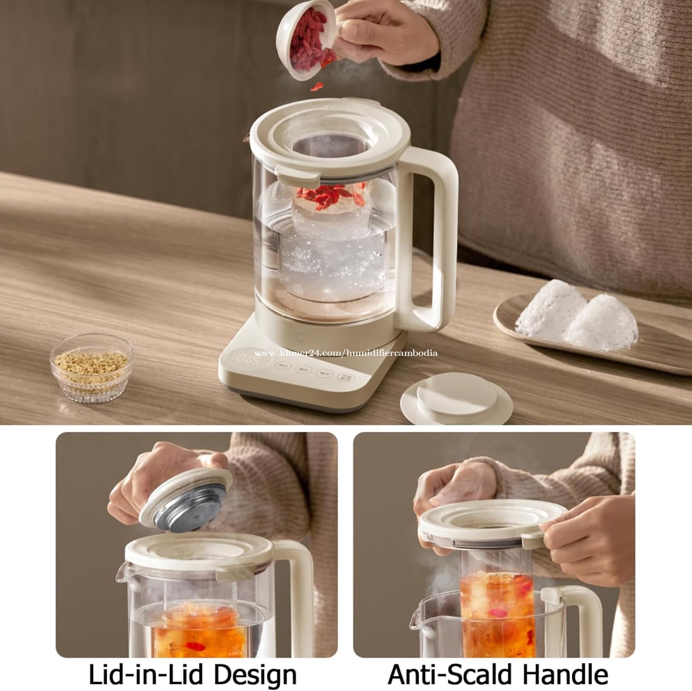 Brand XMIHOME Model Number MJDGNYSHO2DEM Colour Beige Package Dimensions 27.6 x 25.4 x 22.6 cm; 1.42 kg Capacity 1.5 Litres Power/Wattage 800 watts Voltage 220 Volts Material Borosilicate Glass + 316 Stainless Steel Auto shut-off Yes Warranty 1 Year Special Features Temperature Control, Double Wall, Boil Dry Protection, Built-In Infuser, Digital Display, Low Water Sensor, Non-Stick Interior, One Touch Preset, Overheat, Protection, Portable, Programmable, Rapid Boil, Removable Filter, Removable Lid, Shock Resistant, Single Hand Operation Item Weight 1.42 kg