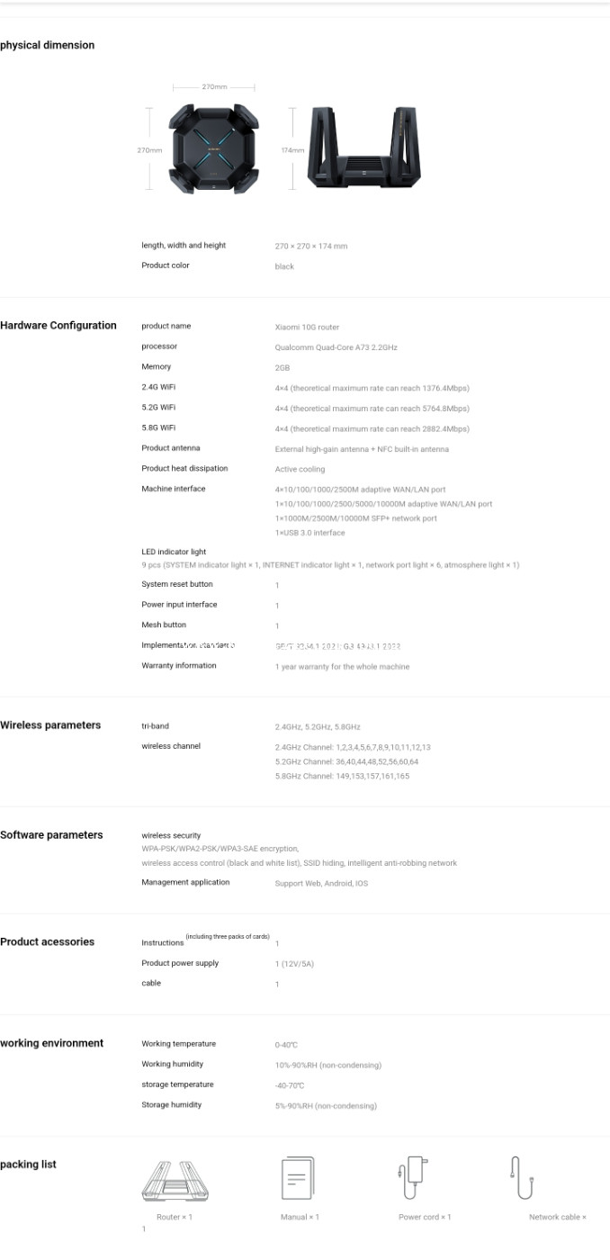 Xiaomi Router AX10000 Wi-Fi 7 Latest Generation Xiaomi 10G Router Xiaomi Router 10000 A Great Premium 10GbE Speedster អស់បញ្ហាល្បឿន មិនបាច់និយាយច្រើន No Problem, don't talk much you are in Latest Generation Xiaomi Cooperate Qualcomm Networking Pro 1220 Tri-Band Wi-Fi 7 networking platform with a 12-stream configuration https://www.mi.com/xiaomi-routers/10000 https://www.qualcomm.com/products/internet-of-things/networking/wi-fi-networks/networking-device-finder/xiaomi-router-10000 ☎️012471xxxClick To Call តំលៃ : $259 បញ្ចុះតម្លៃ លក់ជូនតែ 259$ ស្តុកមានកំណត់ price only 259$ stock limited *Mi Wi-FI 7 Router AX10000, 10000Mbps High Speed Upgrade to latest technology *Product Category High-end Router *Model Xiaomi Mi AX10000 (Xiaomi 10 Gigabit Router) *Design Type Polygonal shape *Color Black *CPU Qualcomm IPQ9570, quad-core A73 2.2GHz *2G DDR4 RAM *Network acceleration engine Qualcomm Networking Pro 1220 *Network protocols IEEE 802.11a/b/g/n/ac/ax IEEE 802.3/3u/3ab/3bz *Maximum wireless transmission speeds (Theoretical) 4x4 2.4GHz up to 1376Mbps 4x4 5.2GHz up to 5764Mbps 4x4 5.8GHz up to 2882Mbps *Frequency Range (Tri-band) 2.4GHz, 5.2GHz, 5.8GHz 2.4G Wi-Fi Wireless Channels 1,2,3,4,5,6,7,8,9,10,11,12,13 5.2GHz Channel 36,40,44,48,52,56,60,64 5.8GHz Channel 149,153,157,161,165 *Network Interface 4x 2.5Gbps WAN/LAN 1×10Gbps adaptive RJ45 WAN/LAN port 1×10Gbps SFP+ port *LED indicator light 8 lights 1x System indicator 1x Internet indicator 1x Network port 5 Types of Atmosphere light *USB 3.0 interface NFC 12 External high-gain antennas (Each antenna group contains three high-gain antennas). 12 independent external signal amplifiers Port aggregation Signal amplifiers 12 independent signal amplifiers *MU-MIMO OFDMA support Wi-Fi Mesh MESH networking Support up to 10 units Wall anchors Dual WAN ports OAM technology *Operating System MiWiFi ROM, an intelligent router operating system deeply customized based on OpenWRT Management application : support Web Chinese, English Android, Ios work with Mi home and Mi wifi App can easily remote to manage online *Wireless security WPA-PSK/WPA2-PSK/WPA3-SAE encryption, wireless access control (black and white list), SSID hiding, intelligent anti-rubbing network *Other Paramaters Status Indicator 7 (top status indicator × 1, network port light × 5, ambient light × 1) *Environmental Standard Working Temperature: 0-40℃ Working Humidity10%-90%RH (non-condensing) Storage Temperature -40-70℃ Storage Humidity 5%-90%RH (non-condensing) *Button 1 system reset button, 1 Mesh button *Voltage 12V/5A Power *Product Size 270×270×174mm *Packing list x1 Xiaomi Mi AX10000 Router x1 Manual x1 Power supply x1 Ethernet/Network Cable. #Xiaomi Router 10000 #Xiaomi 10G Router #Xiaomi Router 10G #Xiaomi Router 10Gigabit #Xiaomi Router AX10000 #Wi-Fi 7 #WiFi 7 #ដុំពង្រីកសេវាអិនធើណិត #ដុំពង្រីកអិនធើណិត #ដុំអ៊ិនធើណិត #ដុំអិនធើណិត #កំពូលរៅទ័រ #កំពូលរ៉ោតទ័រ #ដុំវ៉ាយហ្វាយ #ដុំwifi #ដុំrouter #ហ្គេមរ៉ោតទ័រ #រ៉ោតទ័រហ្គេម #រ៉ោតទ័រ #រ៉ៅទ័រ #រ៉ៅទ័រហ្គេម #ហ្គេមរ៉ៅទ័រ #ប្រព័ន្ធWifi #wireless router #wifi router #wireless repeater #wireless Extender #Xiaomi Router #high speed router #best router #wireless router #wireless repeater #router 2020 #សាវមី #gaming router #router for game #router for school #router for apartment #router for hotel #mesh router #mesh wifi #mesh internet #utra power router #super power router #high quality router #Wifi Extender #Wifi repeater #Wifi router #wifi 5GHz #router 5GHz #WDS #share internet #share wifi #wireless share #internet sharing #boost internet signal