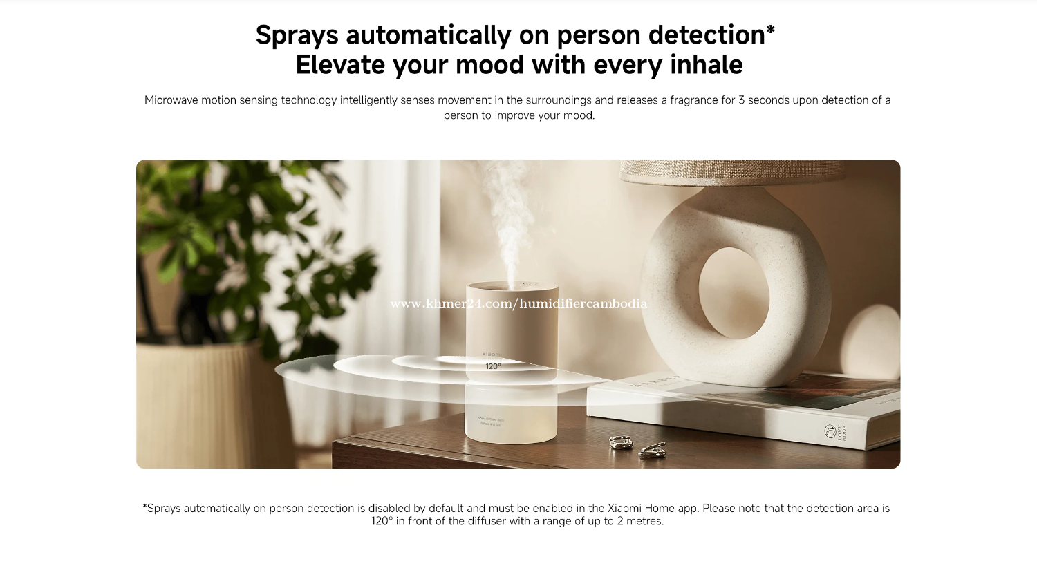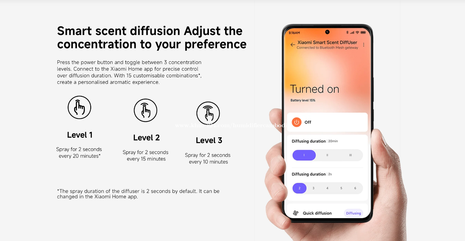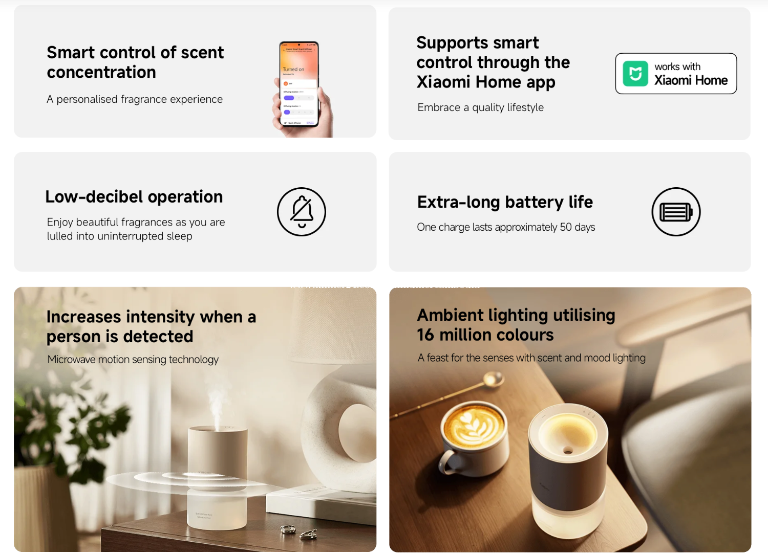 Xiaomi Smart Scent Diffuser Specifications Model MJXFJ03XW Product dimensions 74 x 74 x 75mm Product net weight 154g Main material PP Charging voltage 5V⎓ Charging current 0.5A Rated voltage 3.7V⎓ Rated current 1A Wireless connection Bluetooth low energy Battery type Lithium-ion rechargeable battery Battery life Approx. 50 days (at level 1 diffusion with ambient lighting off) Approx. 6 hours (ambient lighting on) * Operating temperature 5°C–40°C Operating humidity 20%–80%RH Package contents Xiaomi Smart Scent Diffuser x1 Charging cable x1 User manual ×1 Warranty notice x1 *Data tested by the manufacturer. When the diffuser's ambient lighting is set to 100% brightness, the battery can last for approximately 6 hours. At 50% brightness, the battery life is around 10 hours. *This product is only compatible with the standard Xiaomi Smart Scent Diffuser Refill. If scents from other brands are used, effects may vary and they could cause malfunctions. *Tips: Please ensure there are no obstacles above the diffuser to prevent liquid from dripping onto the device and interfering with its operation. Do not rinse or submerge the product in water to avoid the risk of short-circuiting. Only use scents formulated for the diffuser to prevent malfunctioning. Store the product in a cool place, away from direct sunlight and heat sources. Do not use inside a car. Avoid tilting or inverting the device. Fragrances are not for consumption. Seek medical attention immediately if ingested. Keep out of reach of children. If it gets into your eyes, rinse immediately with clean water. When the diffuser is spraying, keep your mouth and nose away from the nozzle to avoid direct inhalation. Those sensitive to fragrances should use the diffuser with caution. Please use only as an air freshener. *15 diffusion combinations: 3 spray interval levels and 5 spray duration options allow for a total of 15 customisable fragrance concentration combinations. *Approximately 50 days of use on a single charge: Data tested by the manufacturer. On a full charge, the diffuser can be used for approximately 50 days on level 1. *Low-decibel operation: The average sound level of the diffuser was tested to be no higher than 30dB. Data tested by the manufacturer.