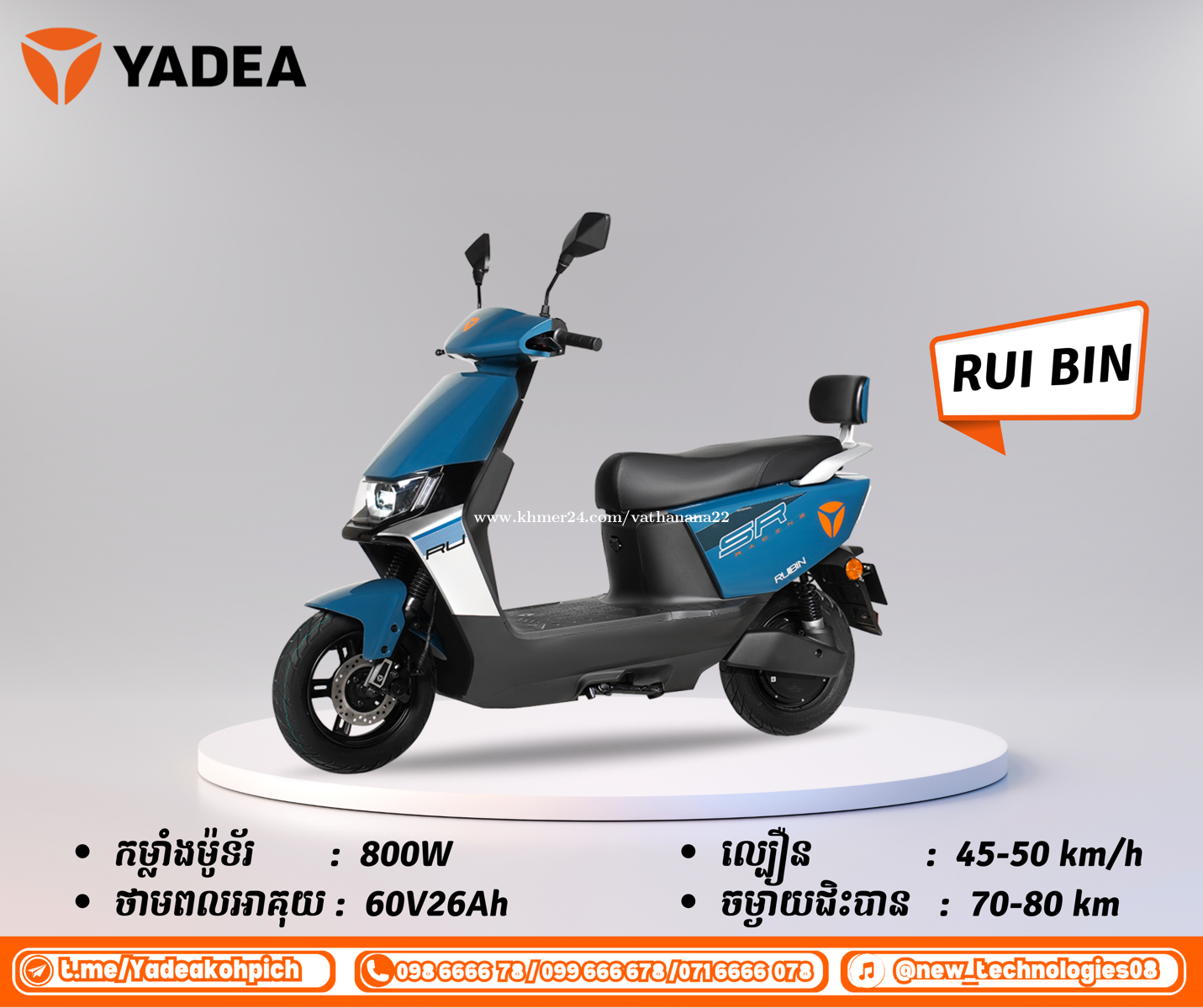 ម៉ូតូអគ្គិសនី ម៉ូឌែល YADEA RUIBIN រូបរាងកាលីបទាន់សម័យ គុណភាពខ្ពស់ សន្សំសំចៃ និង មានតម្លៃសមរម្យ ជាមួយលក្ខណ:ពិសេសដូចជា : អាគុយ : អាគុយស្ងួត (Graphene Battery TTFAR 3rd Generation) កម្លាំងម៉ូទ័រ : 800W ថាមពលអាគុយ : 60V26Ah ល្បឿន : 45-50 km/h ចម្ងាយជិះបាន : 70-80 km ☎️ ទំនាក់ទំនងលេខទូរស័ព្ទ : 095947xxxClick To Call