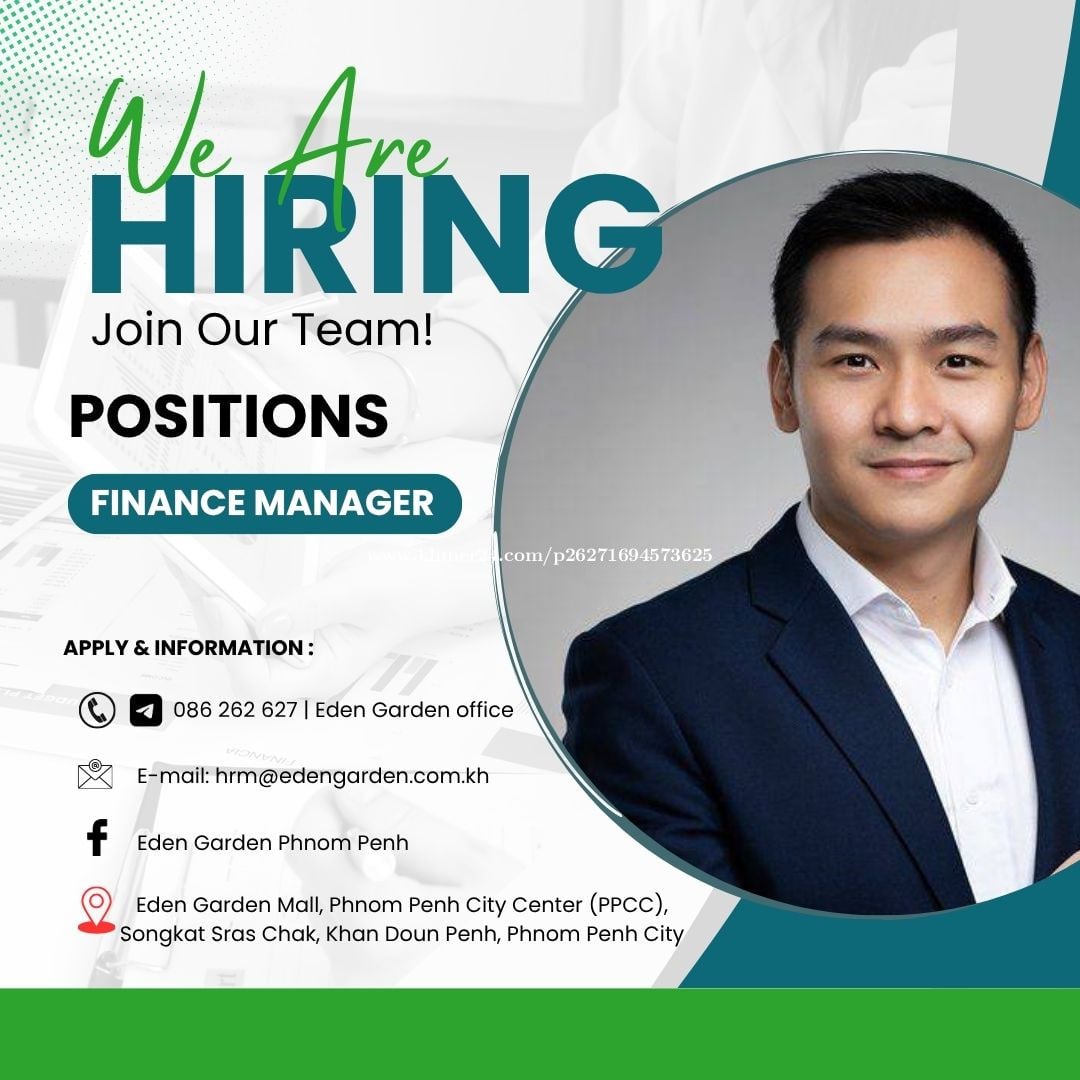 Exciting opportunity! Eden Garden is seeking a skilled Finance Manager to drive financial strategy and support our growth. If you are experienced, motivated, and ready to take on a challenging role, we’d love to hear from you. Apply now and be part of our growing organization! Tele/Contact: 0969540xxxClick To Call Email: [email protected]Click To Sent Email.kh Benefits: * Leaves apply as Labor Law * Quarterly Bonus * NSSF and Private Insurance * 13th Month Salary * Yearly Increment * Meal Allowance * Phone card allowance * Annual Party/Trip