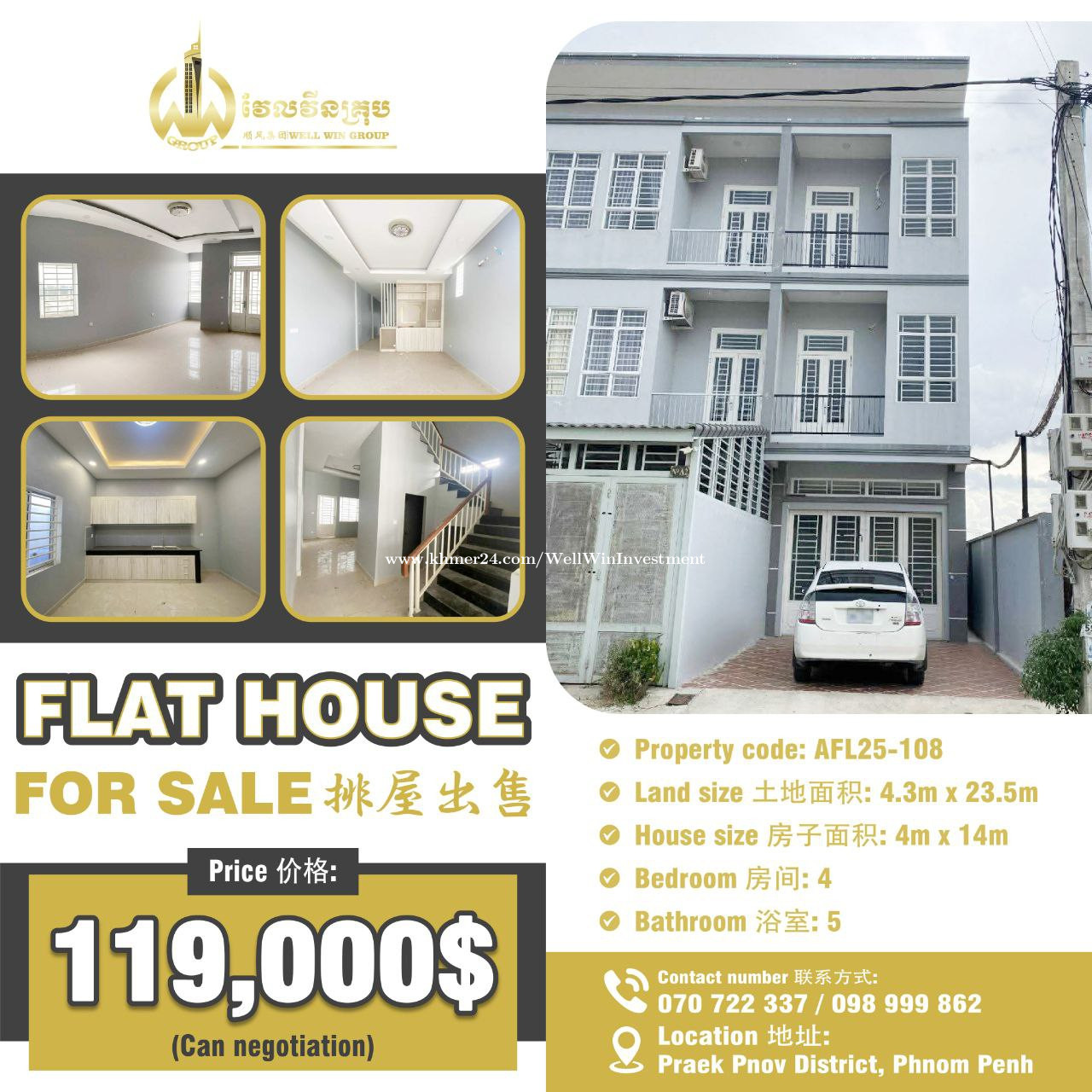 Flat house for sale 排屋出售 Property code: AFL25-108 Price 价格: 119,000$ (Can negotiation) Land size 土地面积: 4.3m x 23.5m House size 房子面积: 4m x 14m Bedroom 房间: 4 Bathroom 浴室: 5 Location 地址: Praek Pnov District, Phnom Penh Contact number 联系方式: 070722xxxClick To Call / 098999xxxClick To Call