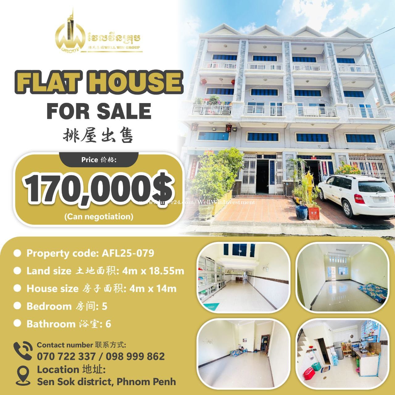 Flat house for sale 排屋出售 Property code: AFL25-079 Price 价格: 170,000$ (Can negotiation) Land size 土地面积: 4m x 18.55m House size 房子面积: 4m x 14m Bedroom 房间: 5 Bathroom 浴室: 6 Location 地址: Sen Sok district, Phnom Penh Contact number 联系方式: 070722xxxClick To Call / 098999xxxClick To Call