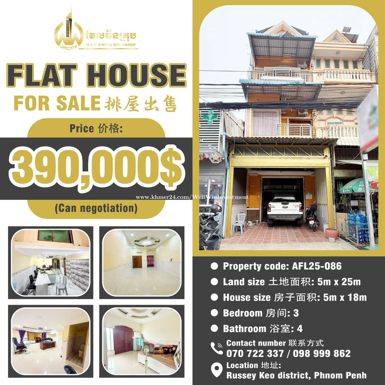 Flat house for sale 排屋出售 Property code: AFL25-086 Price 价格: 390,000$ (Can negotiation) Land size 土地面积: 5m x 25m House size 房子面积: 5m x 18m Bedroom 房间: 3 Bathroom 浴室: 4 Location 地址: Russey Keo district, Phnom Penh Contact number 联系方式: 070722xxxClick To Call / 098999xxxClick To Call