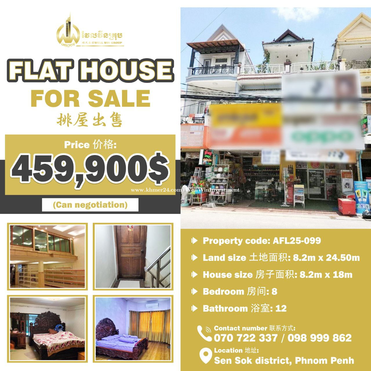 Flat house for sale 排屋出售 Property code: AFL25-099 Price 价格: 459,900$ (Can negotiation) Land size 土地面积: 8.2m x 24.50m House size 房子面积: 8.2m x 18m Bedroom 房间: 8 Bathroom 浴室: 12 Location 地址: Sen Sok district, Phnom Penh Contact number 联系方式: 070722xxxClick To Call / 098999xxxClick To Call