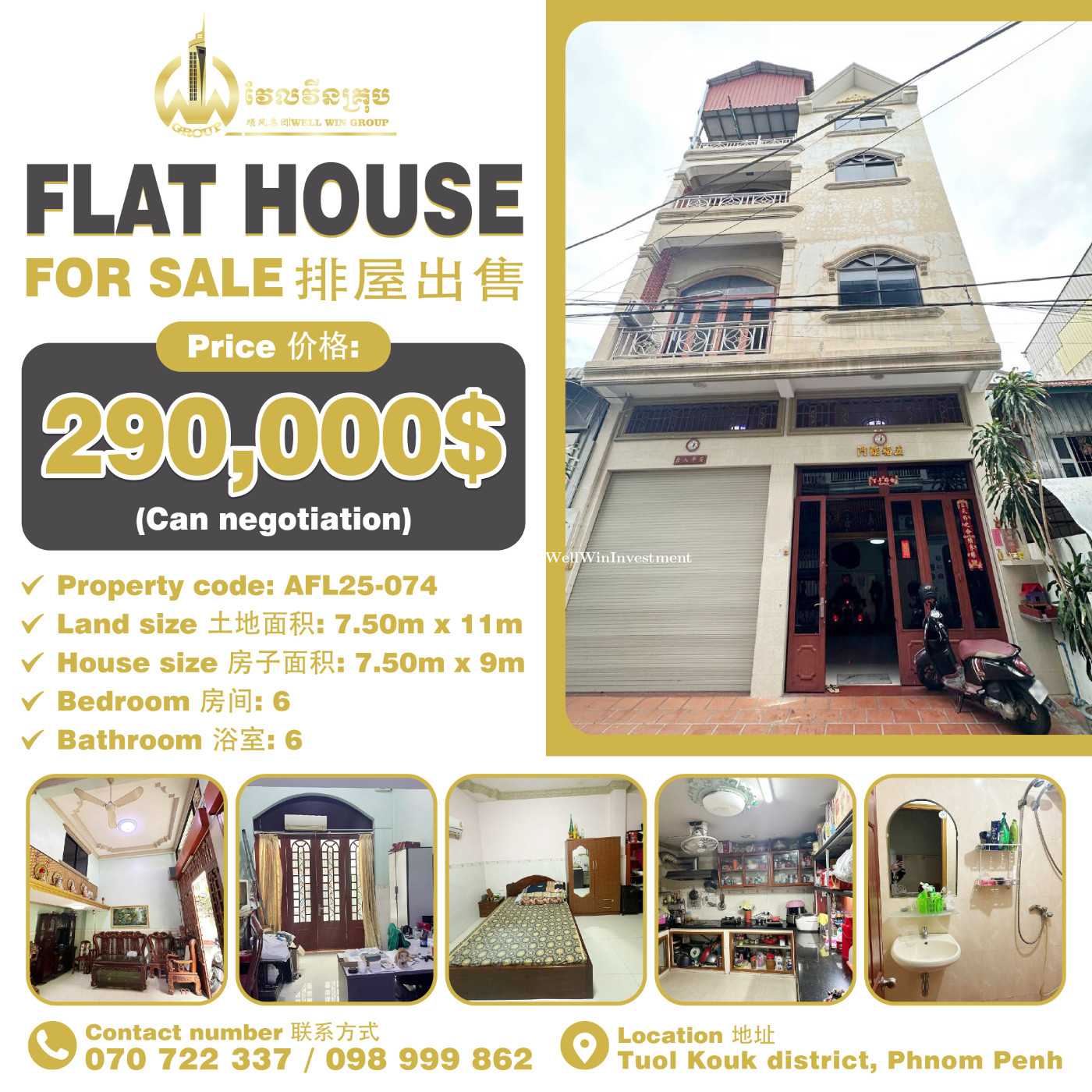 Flat House for sale 排屋出售 Property code: AFL25-072 Price 价格: 95,000$ (Can negotiation) Land size 土地面积: 4.1m x 21.1m House size 房子面积: 4.1m x 16m Bedroom 房间: 3 Bathroom 浴室: 4 Location 地址: Sen Sok district, Phnom Penh Contact number 联系方式: 070722xxxClick To Call / 098999xxxClick To Call