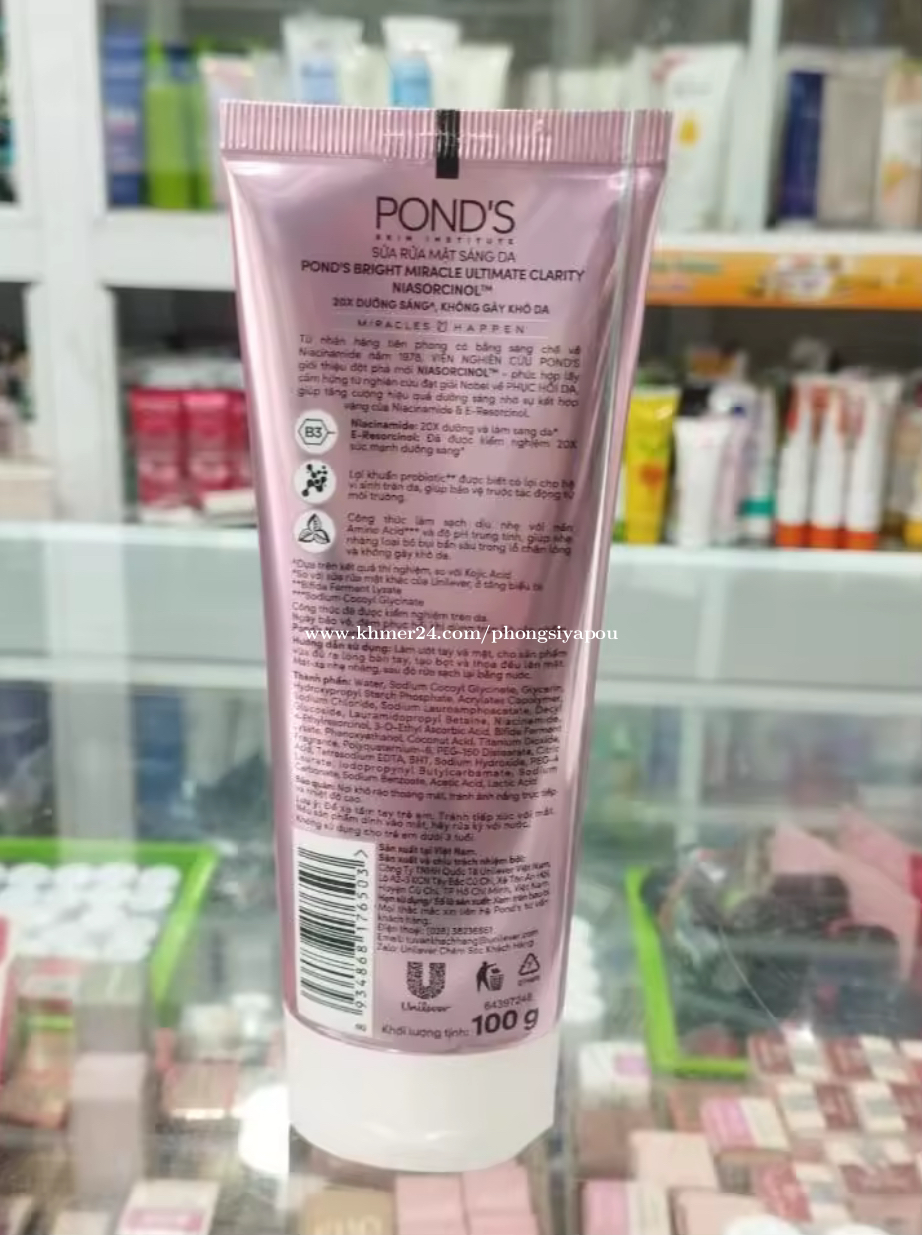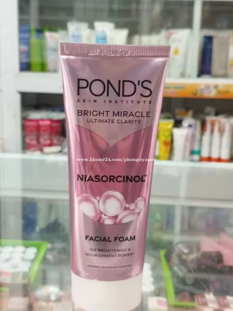 សួស្ដីបងប្អូន ថ្ងៃនេះខ្ញុំធ្វើការណែនាំអំពី Foam លាងមុខ POND’S Bright Miracle Ultimate Clarity Facial Foam ដែលមានបច្ចេកវិទ្យា Niasorcinol™។ សាប៊ូលាងមុខនេះមានអត្ថប្រយោជន៍ជាចម្បងដូចខាងក្រោម៖ ជួយសម្អាតកំទេចកំទី និងកម្ចាត់កខ្វក់លើស្បែកមុខបានស្អាតជ្រាលជ្រៅ។ ផ្ដល់អានុភាពបំភ្លឺស្បែក ដោយមាន 20x Brightening Power ធ្វើឲ្យស្បែកមុខមើលទៅភ្លឺថ្លាឡើង។ ជួយចិញ្ចឹមស្បែក ឲ្យមានសំណើម មិនធ្វើឲ្យស្បែកស្ងួតបន្ទាប់ពីលាង។ ជួយកាត់បន្ថយស្នាមប្រឡាក់ខ្មៅ និងភាពស្មើរមិនស្មើរនៃពណ៌ស្បែក។ មានរូបមន្តស្រាលងាយប្រើ ហើយសាកសមសម្រាប់ប្រើប្រាស់ប្រចាំថ្ងៃ។ បានធ្វើតេស្តដោយវេជ្ជបណ្ឌិតស្បែក ដូច្នេះមានសុវត្ថិភាពក្នុងការប្រើប្រាស់។ 👉 សរុបគឺ foam លាងមុខនេះមិនត្រឹមតែជួយសម្អាតទេ ប៉ុន្តែអាចផ្ដល់អោយស្បែកមុខភ្លឺថ្លា ស្មើរមានសំណើម និងមានសុខភាពល្អជាងមុន។