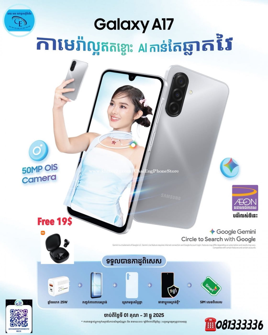 📣 Galaxy A17 កាមេរ៉ាល្អឥតខ្ចោះ, AI កាន់តែឆ្លាតវៃ, ស្វែងរកអ្វីៗកាន់តែងាយ ✨ #GalaxyA17 មកជាមួយមុខងារពិសេសៗដូចជា 👇 👍 📷 កាមេរ៉ាក្រោយ បីគ្រាប់ 50MP+5MP+2MP និងកាមេរ៉ាមុខ 13MP 👍 បំពាក់ដោយមុខងារ AI ✨ , Google Gemini និង Circle to Search 👍 អេក្រង់ធំ 6.7” FHD+ Super AMOLED, Refresh Rate 90Hz 🏎️ 👍 ទំហំផ្ទុក RAM 8GB / ROM 128GB ឬ 256GB អាចថែមមេម៉ូរីកាតបានរហូតដល់ 2TB 👍 ទំហំថ្ម 5,000mAh 🔋 👍 ការពារជម្រាបទឹកកម្រិត IP54 💦 👍 ដំណើរការដោយ One UI7 និងមានប្រព័ន្ធការពារសុវត្ថិភាពដោយ Knox Security 🛡️ 🔴 អាប់ដេត OS បាន 6 ដង និងអាប់ដេតប្រព័ន្ធសុវត្ថិភាពបាន 6 ឆ្នាំ 💪 ជាមួយនឹងការផ្តល់ជូនដូចជា៖ 🎁 ថែមជូនឆ្នាំងសាកល្បឿនលឿន 25W 🎁 កញ្ចក់ការពារអេក្រង់ 🎁 ស្រោមទូរស័ព្ទថ្លា 🎁 ការធានាលើអេក្រង់ពេញមួយឆ្នាំ* 🎁 ស៊ីមកាតលេខពិសេសមួយពីស្មាត 🔥 ការដូពីហាងផ្ទាល់ កាសប្លូធូហ្សុីន Redmi Bud6 Play តម្លៃ 19$(បើអត់យកការដូហាងទេ ចុះលុយជូន10$) 👉 ទិញក៏បាន | បង់រំលស់ក៏បាន | ប្រើVISA Cardក៏បាន 👉 មានសេវាកម្មដឹកជញ្ជូនដល់កន្លែងនិងផ្ញើរជូន25ខេត្តក្រុង សំរាប់ពត័មានបន្ថែមសូមទាក់ទងមកកាន់លេខទូរសព្ទ័ ☎️ 081 333336, 076 2333336, 017 226338, 067 226338 👉 Telegram Shop:☎️081333xxxClick To Call https://t.me/CE_PhoneShop តម្លៃពិសេសល្អមាននៅទីនេះ #ChaiEngPhoneShop #CE #ChaiEngPhoneStore2 #SuperScreenSuperCameraSuperAI #GalaxyA17