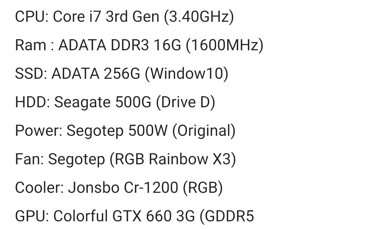 មិនសូវបានប្រើចង់លក់វិញ CPU: Core i7 3rd Gen (3.40GHz) Ram : ADATA DDR3 16G (1600MHz) SSD: ADATA 256G (Window10) HDD: Seagate 500G (Drive D) Power: Segotep 500W (Original) Fan: Segotep (RGB Rainbow X3) Cooler: Jonsbo Cr-1200 (RGB) GPU: Colorful GTX 660 3G (GDDR5 Monitor 24 +Key +mouse មានfile GTA5 ស្រាប់យកទៅតំឡើងខ្លួនឯង