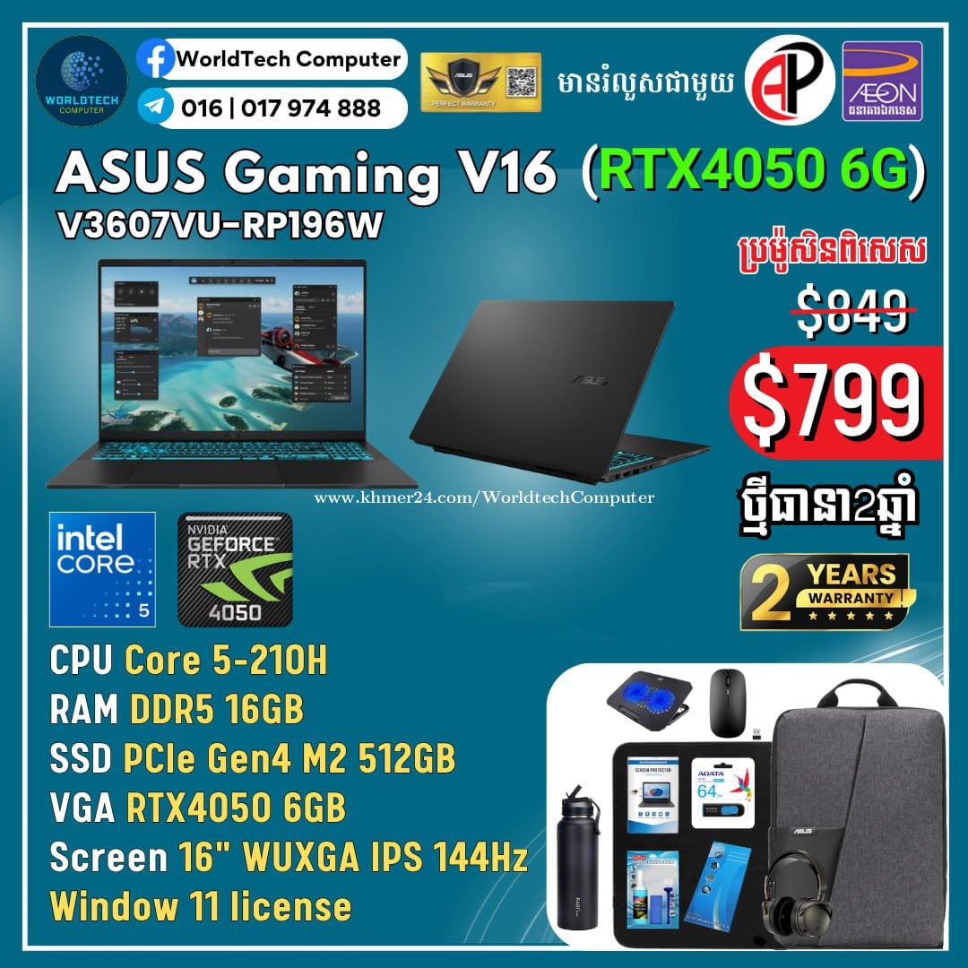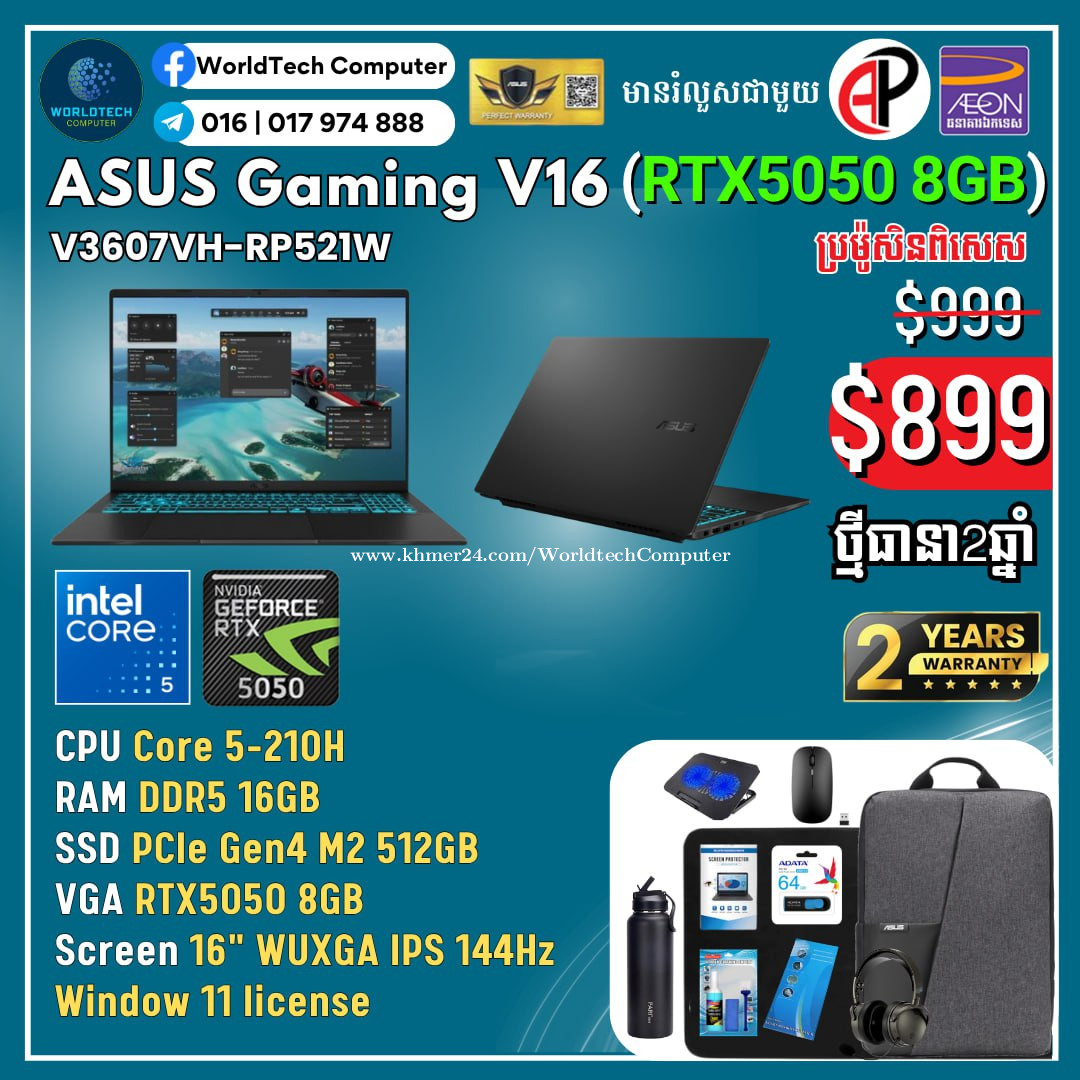 Asus Gaming V16 16" , Gaming ចុងឆ្នាំ2025 Core5-210H 16G M2 512G RTX4050 6G 16" 144Hz New2025=799$ Core5-210H 16G M2 512G RTX5050 8G 16" 144Hz New2025=899$ Core7-240H 16G M2 1TB RTX5060 8G 16" 144Hz New2025=1149$ New Warranty 2years (Perfect Warranty 1year) ទីតាំងហាង: ផ្ទះ39Eo ផ្លូវ257 ទឹកល្អក់3 ទួលគោក ភ្នំពេញ (ខាងលិចស្តុបទេពផនប្រហែល 300ម)។ Telegram: 017974xxxClick To Call , Tel : 016 | 017974xxxClick To Call