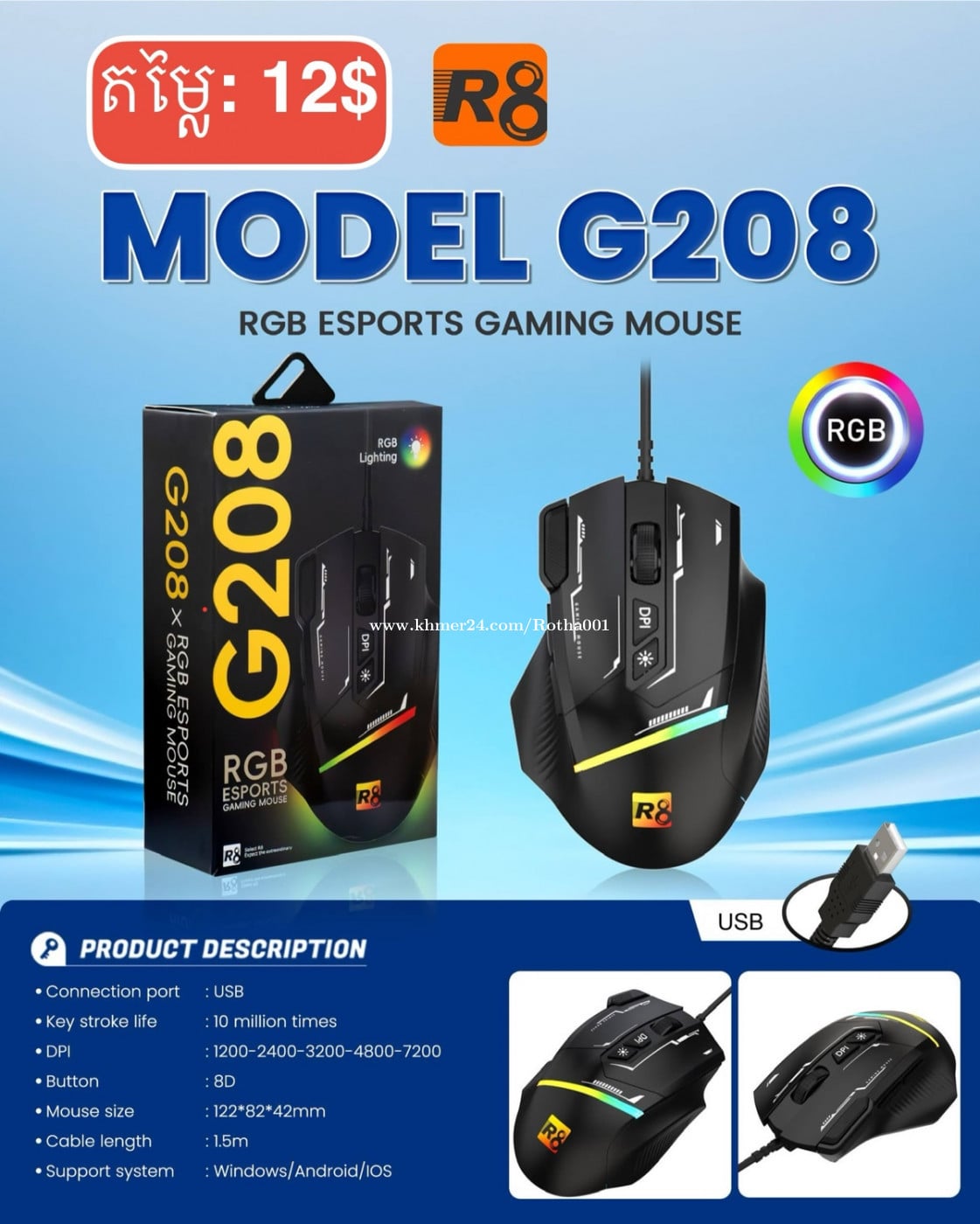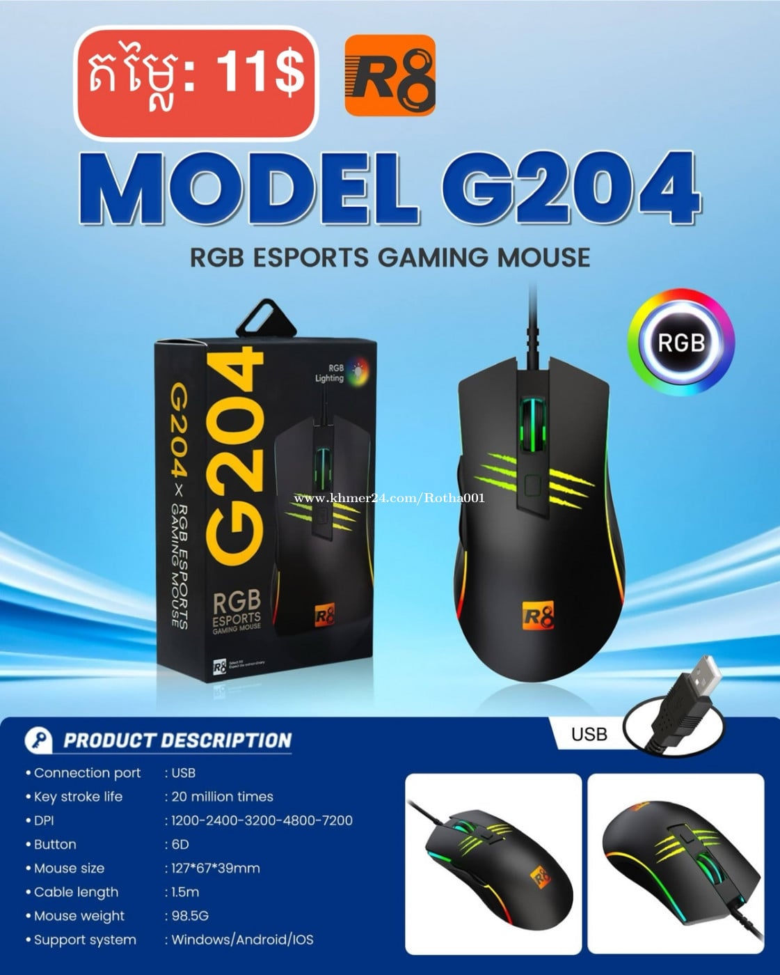 R8 Gaming Wired Mouse ថ្មីគុណភាពល្អ 👉Gaming Mouse (wired)G204 = 11$ 👉Gaming Mouse (wired)G208 = 12$ 👉Gaming Mouse G300 (bluetooth & wireless) = 12$ ------------- ទីតាំង : ផ្លូវសម្តេចមុនីរ៉េត (217) ផ្សារចេនឡា (ជាប់ផ្សារដេីមគរ) ភ្នំពេញ ច្រកទី3 តូប C2-64 Tel : O15 95 94 64 Tel : O92 894 591 Telegram Telegram : https://t.me/Thanrotha