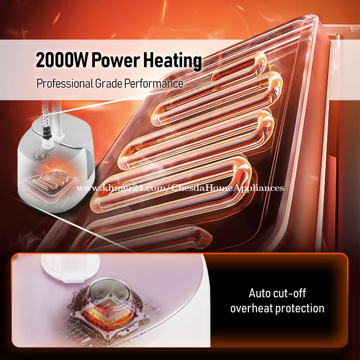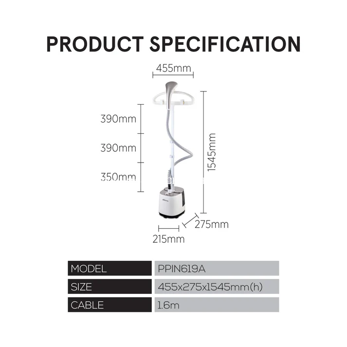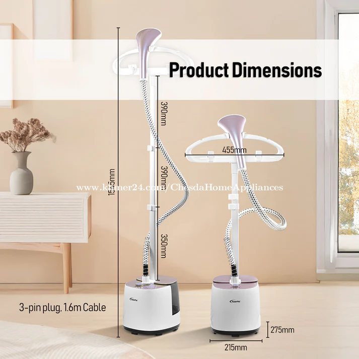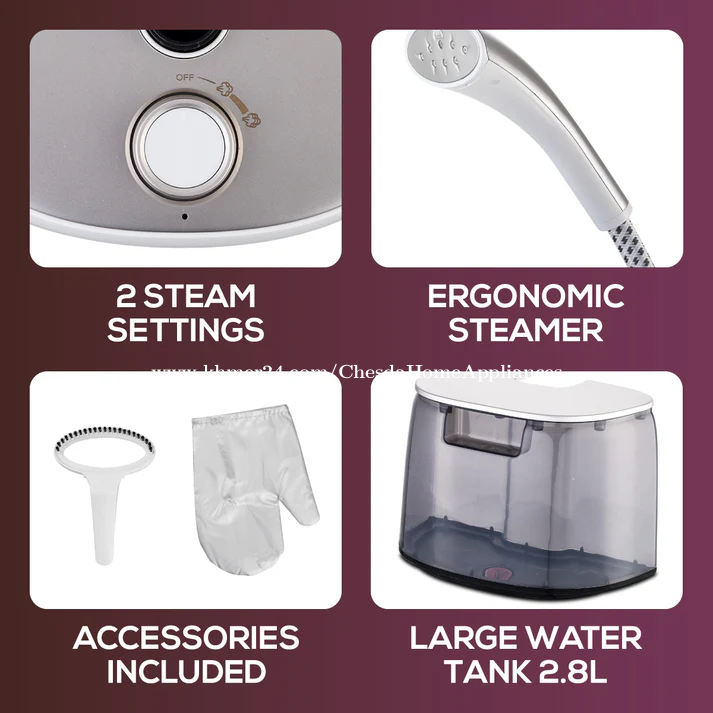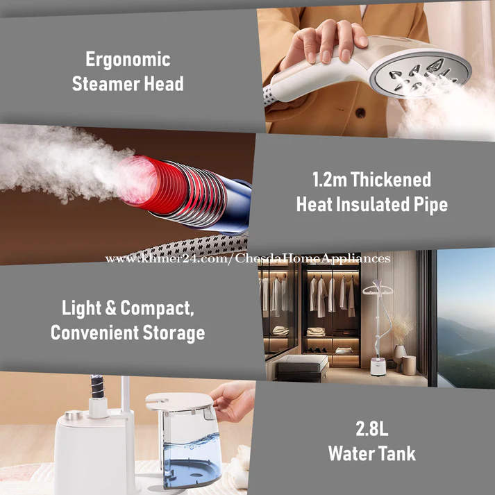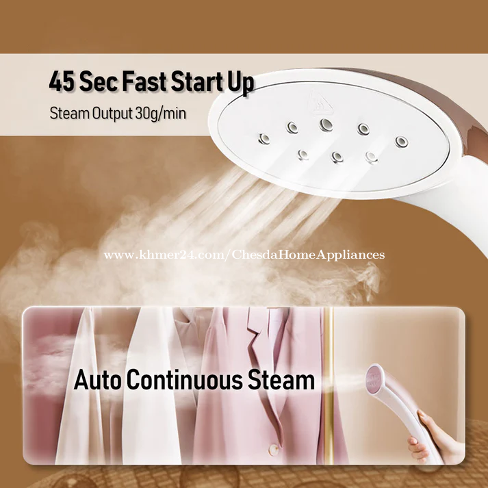 Garment Steamer is suitable for quick "ironing" for busy working executives. Garment Steamer With 2 Heat Selector 2.8L Water Tank (PPIN619A) It comes with 2 Steam Settings Adjustable Temperature Control Knob , fast start up and continuous steam for 45 minutes. This Garment Steamer is ideal for homes & boutiques. It also comes with hanger for easy & fast to steam your garment. —————————————————— ☎️ 085559xxxClick To Call 🌐 @ChesdaHomeAppliance Chhanel Telegram: https://t.me/ChesdaHomeAppliances 🌐 ChesdaHomeAppliances https://www.facebook.com/ChesdaHomeAppliances With 2.8L water tank capacity enables a longer usage period before requiring refills thus saving time. The Automatic continuous steam flow spray of up to 1.2m which is very powerful. Easy and quick de-wrinkling and is suitable for delicate fabrics, curtains, drapes, upholstery & etc. You can use it either to spray the steam horizontally or vertically which is very convenient. The foldable 360 degree swivel hook, swivel and extends for quick and easy steaming. It is Light and Compact and it is easy to store if space storage is a constraint and also comes with overheat protection. With 1.8m cord length which is provided so that you do not need to use any extension socket which is quite messy at times. Portable 2 in 1 Garment Steamer PPIN619A also comes with Auto Shut-Off to protect users and over-heating.