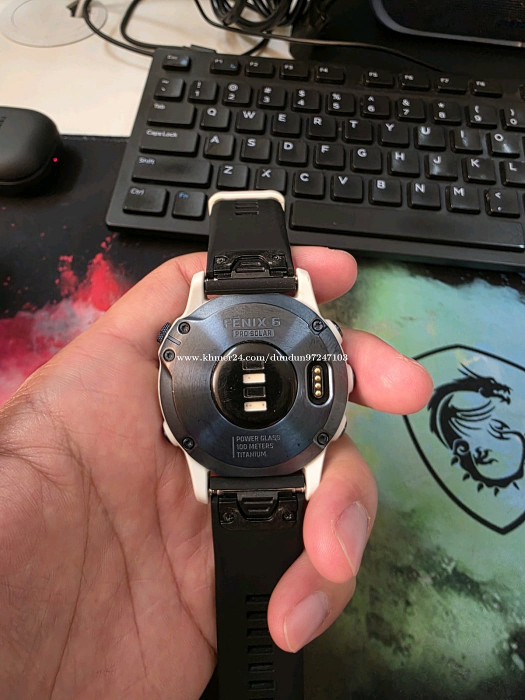 នាឡិកាស្អាត Garmin Fenix 6 pro solar ថ្មកាន់ នៅថ្មី៩៨% ខ្សែសាកហ្ស៊ីន ខ្សែរពណ៌សហ្ស៊ីន មានខ្សែពណ៌ទឹកក្រូច និងខ្មៅ Free
