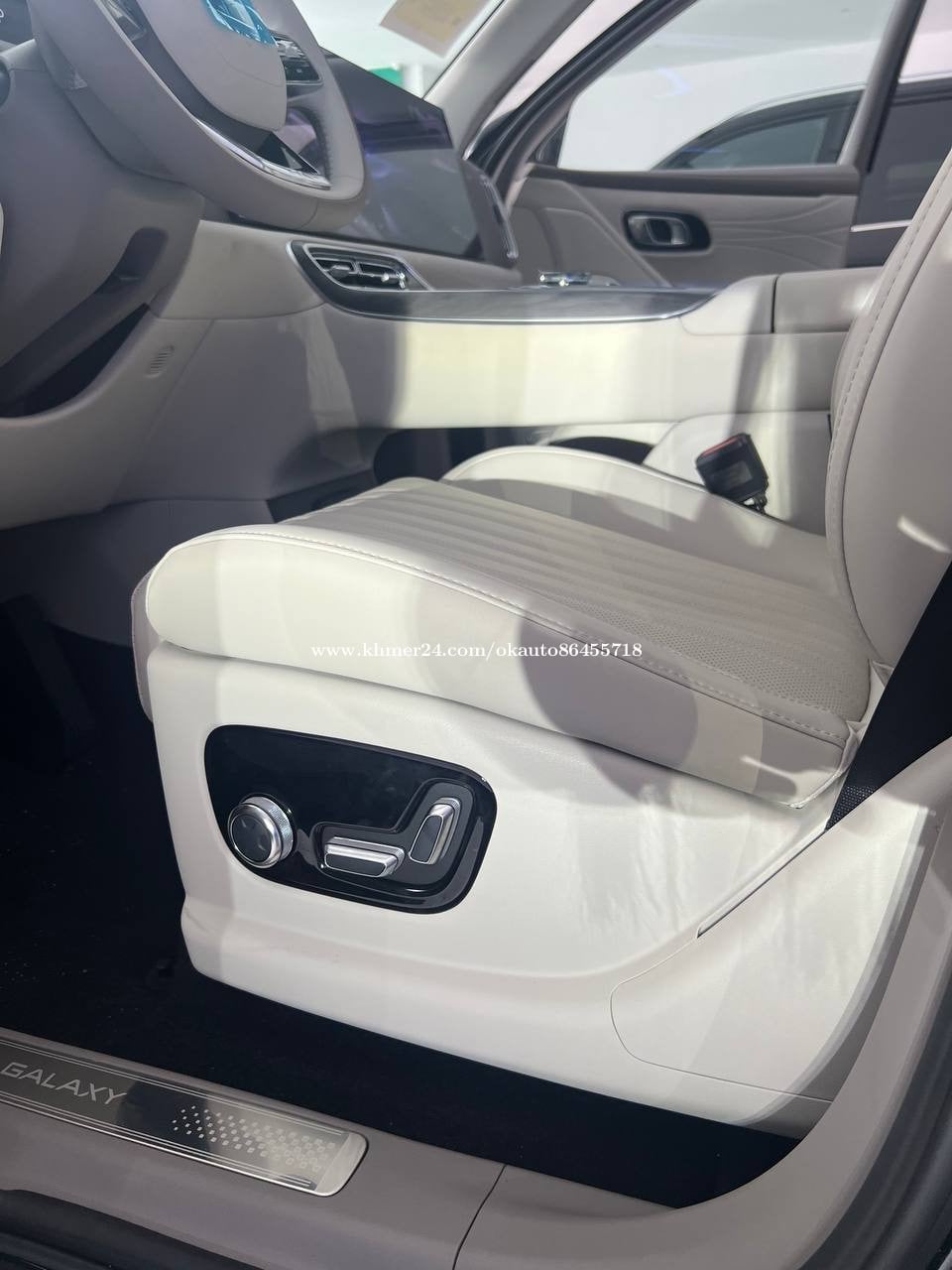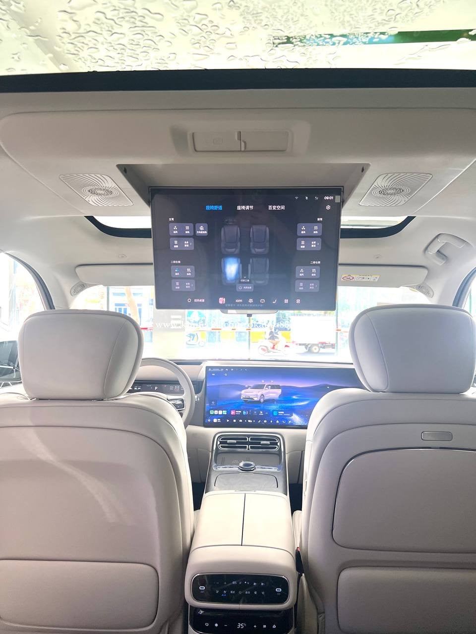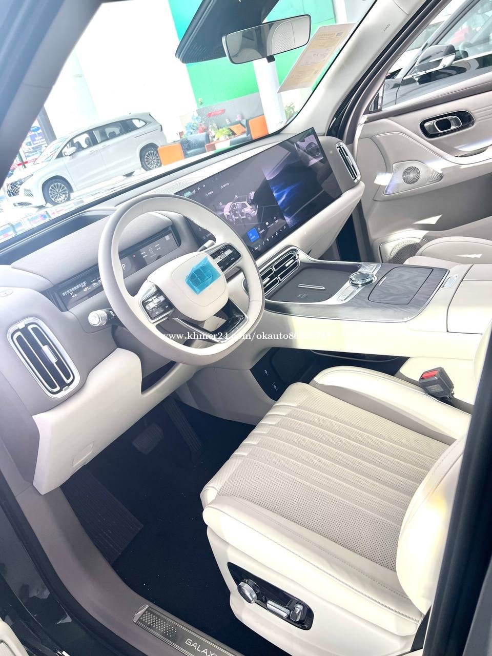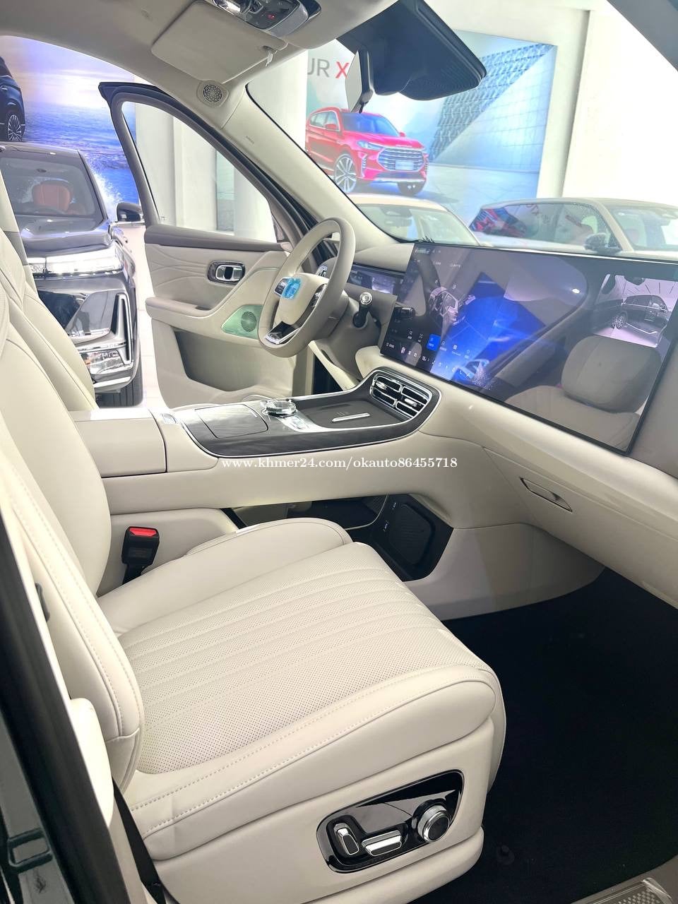 Geely M9 Size:5.2m Longer (S7:4.9m) Engine: 1.5T(CLTC:220km/ T.R: 1300km) LED: 30 inches widely Interior color: white Exterior: green