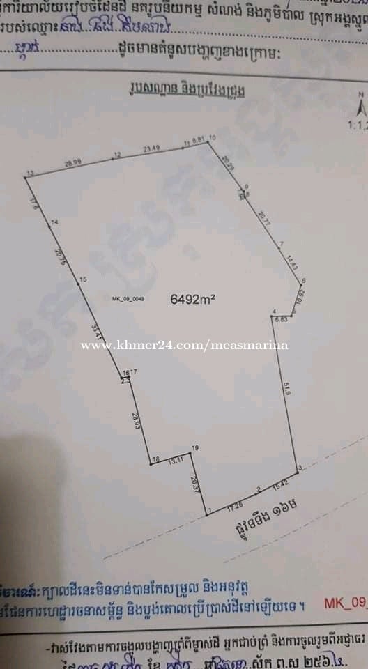 ដីលក់បន្ទាន់តម្លៃល្អ អាចទុកចំណេញ សង់ឃ្លាំង សង់ផ្ទះលក់ ឬសង់លំនៅដ្ឋានរស់នៅបែបធម្មជាតិ ទីតាំងនៅភូមិ ស្រែកណ្តាល ឃុំម្កាក់ ស្រុក អង្គស្នួល ខេត្តកណ្តាល ចុះពីផ្លូវ 130 ប្រហែល 100ម ( ខាងលិចភ្នំបាសិទ្ធ) ទំហំ: 6492sqm តម្លៃបន្ទាន់: 45$/sam ចរចា Tell: