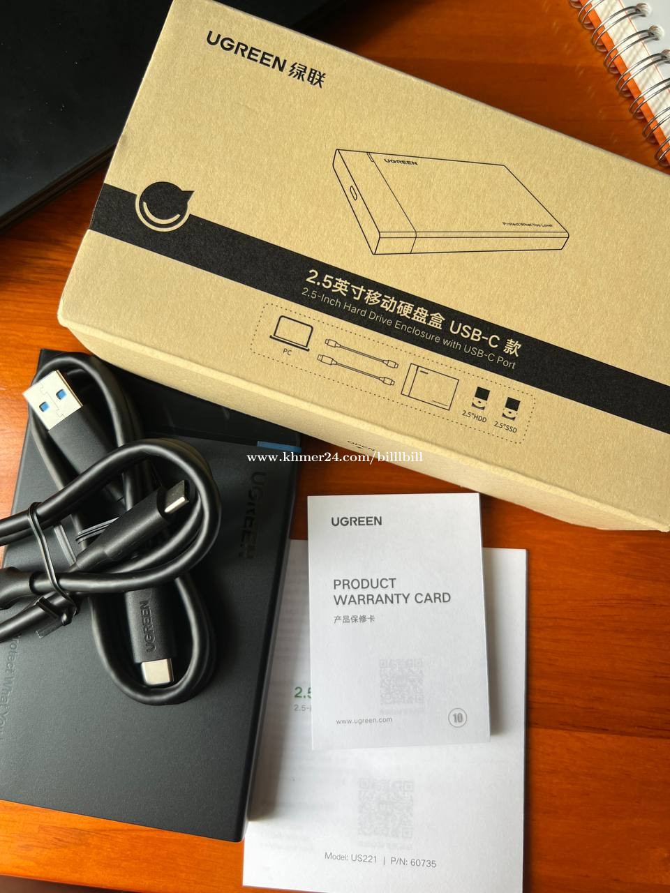 UGREEN Case External HDD, SATA 2.5: - ល្បឿនក្នុងការ transfer data រហូតដល់ 6 Gbps - ប្រើប្រាស់ខ្សែ Type C ជាមួយនឹង Port Type C - HHD external case ទទួលបាន ខ្សែ២ប្រភេទ ដូចជាខ្សែប្រភេទ Type C- Type C និង Type C - USB 🪧FREE Delivery Telegram account: @bx_bill Phone Number: 0964123xxxClick To Call (For call ONLY)