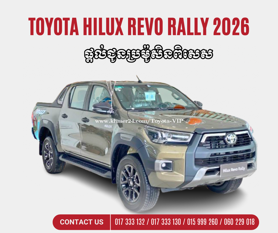 រថយន្តមានក្នុងស្តុកស្រាប់ ជាមួយនឹងប្រម៉ូសិនពិសេស‼️ តម្លៃត្រឹមតែ 𝟓𝟎,𝟔𝟎𝟎$ សម្រាប់ប្រម៉ូសិននៅក្នុងខែនេះ អតិថិជននឹងទទួលបាន 🔹ការចាប់អាំងប៉ាវដែលមានទឹកប្រាក់ចាប់ពី 𝟐𝟔𝟖$ ដល់ 𝟓𝟔𝟖$ 🔹ហ្វ្រីដឹកជូនដល់ទីតាំង 🔹ទទួលបានគូប៉ុង 𝟓𝟎𝟎$ សម្រាប់ការវៃដូស៊េរី 𝐓𝐨𝐲𝐨𝐭𝐚 𝐇𝐢𝐥𝐮𝐱 𝐑𝐞𝐯𝐨 𝐑𝐚𝐥𝐥𝐲 𝟐𝟎𝟐𝟔 ជារថយន្ត 𝐏𝐢𝐜𝐤𝐮𝐩 ដែលបានបំពាក់ដោយម៉ាស៉ីនម៉ាស៊ូត ទំហំ 𝟐.𝟖𝐋 អាចផលិតកម្លាំងសេះបាន 𝟐𝟎𝟏𝐡𝐩 និងកម្លាំងរមួល 𝟓𝟎𝟎𝐍𝐦 រួមជាមួយប្រអប់លេខ 𝟔វគ្គស្វ័យប្រវត្តិ ចំណុចពិសេសៗនៅលើរថយន្តនេះមានដូចជា ៖ ▪️ម៉ាស៉ីនត្រជាក់ខាងមុខប្រភេទ 𝐃𝐮𝐚𝐥 𝐙𝐨𝐧𝐞 ▪️ប្រអប់សម្រាប់ដាក់ភេសជ្ជៈ 𝐂𝐨𝐨𝐥 𝐁𝐨𝐱 ▪️ប្រព័ន្ធបើកបរ 𝐄𝐜𝐨 𝐦𝐨𝐝𝐞 & 𝐏𝐨𝐰𝐞𝐫 𝐦𝐨𝐝𝐞 ▪️ប្រព័ន្ធកម្សាន្ត 𝟗 អ៉ីញ 𝐓𝐨𝐮𝐜𝐡𝐬𝐜𝐫𝐞𝐞𝐧 ភ្ជាប់មុខងារ 𝐀𝐩𝐩𝐥𝐞 𝐂𝐚𝐫𝐏𝐥𝐚𝐲 & 𝐀𝐧𝐝𝐫𝐨𝐢𝐝 𝐀𝐮𝐭𝐨 ▪️ប្រព័នសុវត្ថិភាព 𝐓𝐨𝐲𝐨𝐭𝐚 𝐒𝐚𝐟𝐞𝐭𝐲 𝐒𝐞𝐧𝐬𝐞 ( 1. 𝐋𝐃𝐀 ប្រព័ន្ធផ្ដល់សញ្ញាពេលរថយន្តរេចាកគន្លងផ្លូវ 2. 𝐃𝐑𝐂𝐂 ប្រព័ន្ធរក្សាល្បឿន បន្ថែម និងបន្ថយ ដោយស្វ័យប្រវត្តិ 3. 𝐏𝐂𝐒 ប្រព័ន្ធផ្ដល់សញ្ញាគ្រោះថ្នាក់ និងចាប់ហ្វ្រាំងស្វ័យប្រវត្តិ ) ▪️𝐂𝐚𝐦𝐞𝐫𝐚 𝟑𝟔𝟎 ▪️𝐁𝐥𝐢𝐧𝐝 𝐒𝐩𝐨𝐭 𝐌𝐨𝐧𝐢𝐭𝐨𝐫𝐢𝐧𝐠 នៅលើកញ្ចក់សងខាង ▪️Speaker 𝐉𝐁𝐋 𝟗គ្រាប់ ▪️សេនសឺ 𝟔គ្រាប់ និងមានមុខងារ ជាមួយនឹងប្រព័ន្ធហ្វ្រាំងពិសេសៗច្រើនទៀត … សម្រាប់ព័ត៌មានលម្អិត សូមទំនាក់ទំនងផ្នែកលក់រថយន្ត៖ ☎️ 017333xxxClick To Call / 017333xxxClick To Call (𝐂𝐞𝐥𝐜𝐚𝐫𝐝) ☎️015999xxxClick To Call (𝐒𝐦𝐚𝐫𝐭) ☎️060229xxxClick To Call (𝐌𝐞𝐭𝐟𝐨𝐧𝐞) 👉 𝐓𝐞𝐥𝐞𝐠𝐫𝐚𝐦 𝐂𝐡𝐚𝐧𝐧𝐞𝐥:https://t.me/toyota_aws 👉 KH24 : https://www.khmer24.com/Toyota-VIP 👉 𝗪𝗲𝗯𝘀𝗶𝘁𝗲 : https://www.toyota.com.kh/en.html