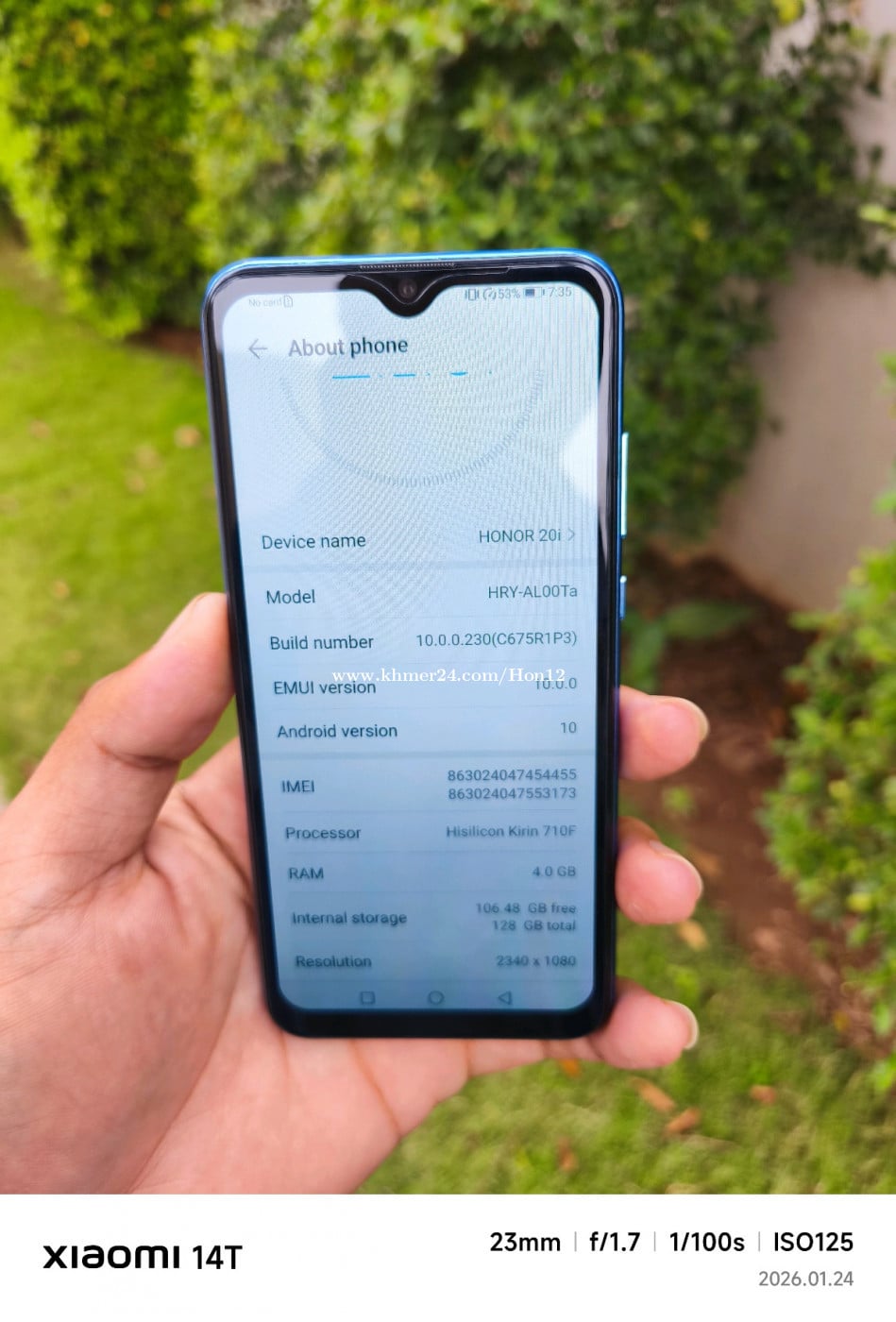អេក្រង់: 6.21 អ៊ីញ ប្រភេទ IPS LCD (Full HD+) រូបរាងតូចច្រឡឹង កាន់ក្នុងដៃល្មម។ បន្ទះឈីប: Kirin 710 (12 nm) ដើរស្រួលសម្រាប់ការប្រើប្រាស់ App ទូទៅ និងលេងហ្គេមមធ្យម។ អង្គចងចាំ (RAM): 4GB /128GB ទំហំផ្ទុក (Storage): 128GB (ផ្ទុកបានច្រើន មិនងាយពេញ) កាមេរ៉ាក្រោយ (3 គ្រាប់): 24 MP (មេ) 8 MP (Ultrawide) 2 MP (Depth - ជំនួយការថតព្រាល) កាមេរ៉ាមុខ (Selfie): 32 MP (ច្បាស់ខ្លាំង ស័ក្តិសមសម្រាប់អ្នកចូលចិត្តថតរូប) ថាមពលថ្ម: 3,400 mAh ប្រព័ន្ធសុវត្ថិភាព: ស្កេនក្រយៅដៃផ្នែកខាងក្រោយ និងស្កេនមុខ។
