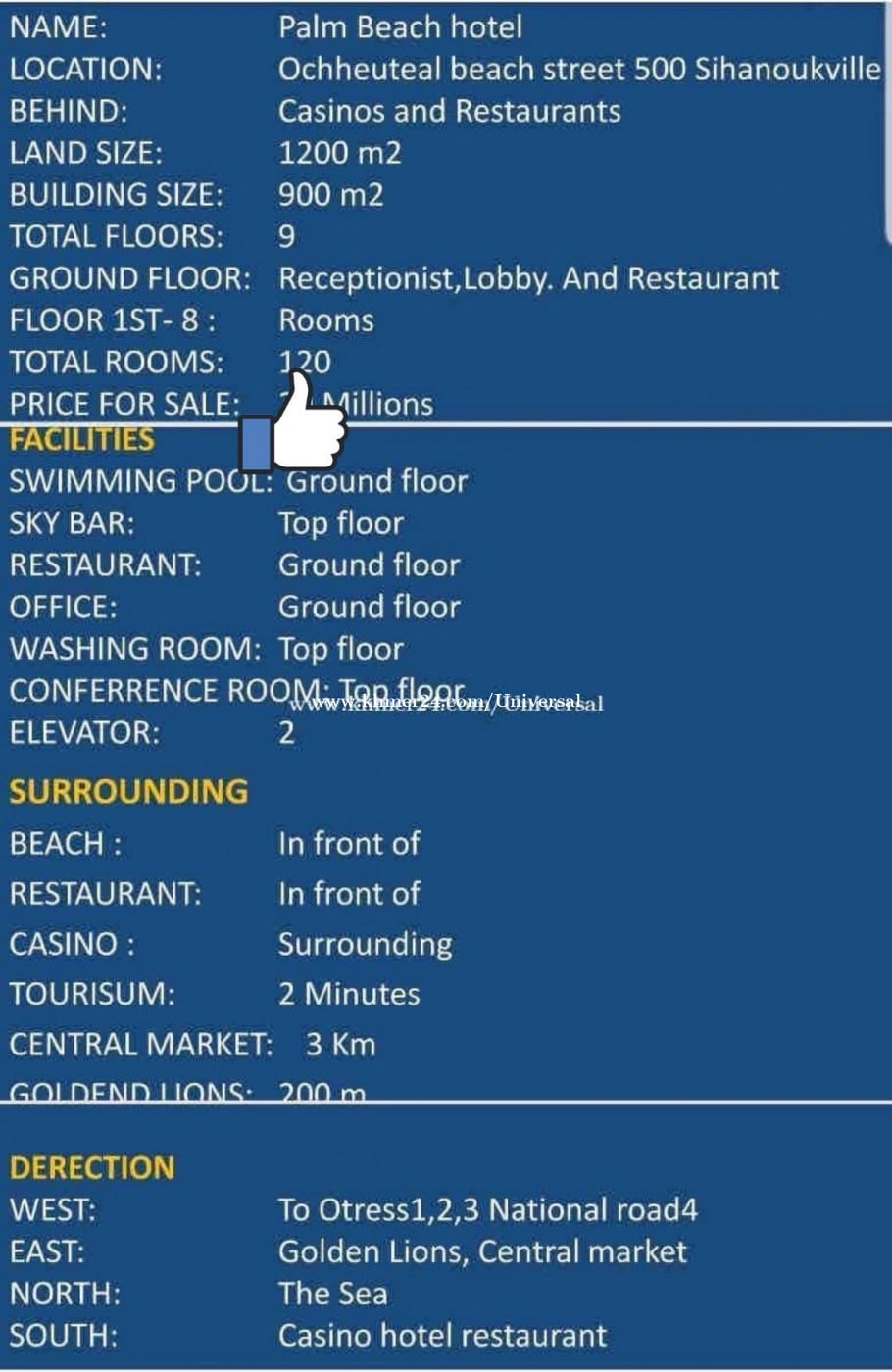 Beautiful hotel for sale location close to the Ocheuteal beach beach with good sea views good for run business Bedroom:120 Bathroom:123 Bar and restaurant Swimming pool =1 Land size=1200m2 Building size =900m2 Floor total =9th Sky bar top floor Restaurant group floor Price For Sale =12M negotiate https://t.me/Sakal198 If you are interesting and need more information please feel free don't be hesitate to contact us for viewing Tel:0979666xxxClick To Call/017878xxxClick To Call/016878xxxClick To Call(WhatsApp, WeChat, Telegram)